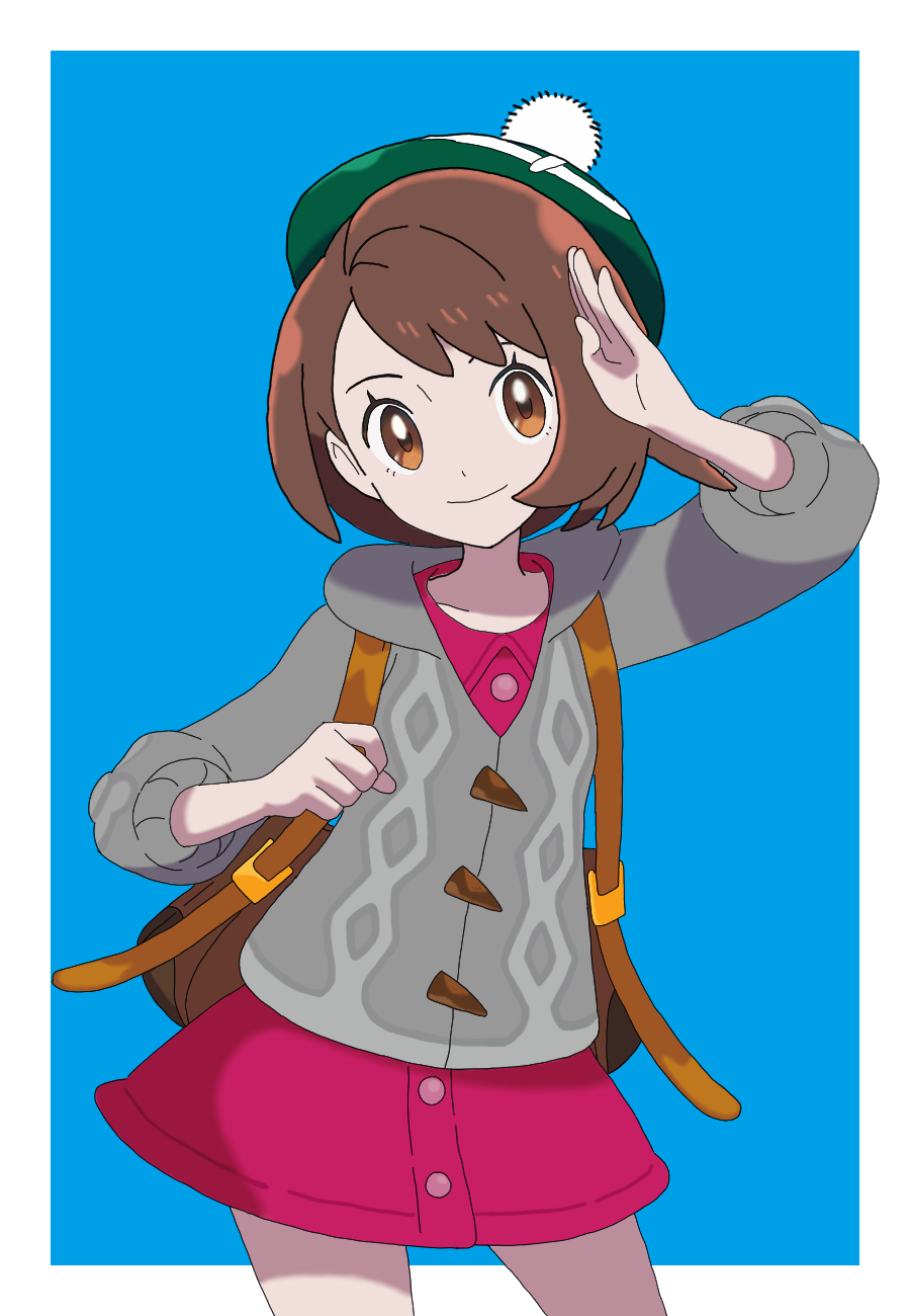 1girl backpack bag blue_background border brown_bag brown_eyes brown_hair buttons cable_knit cardigan closed_mouth collared_dress commentary_request cowboy_shot dress gloria_(pokemon) green_hat grey_cardigan hand_up hat highres holding_strap hood hood_down hooded_cardigan looking_at_viewer nagareboshi_(sukoya001) nintendo outside_border pokemon pokemon_sword_and_shield short_hair smile solo tam_o'_shanter white_border