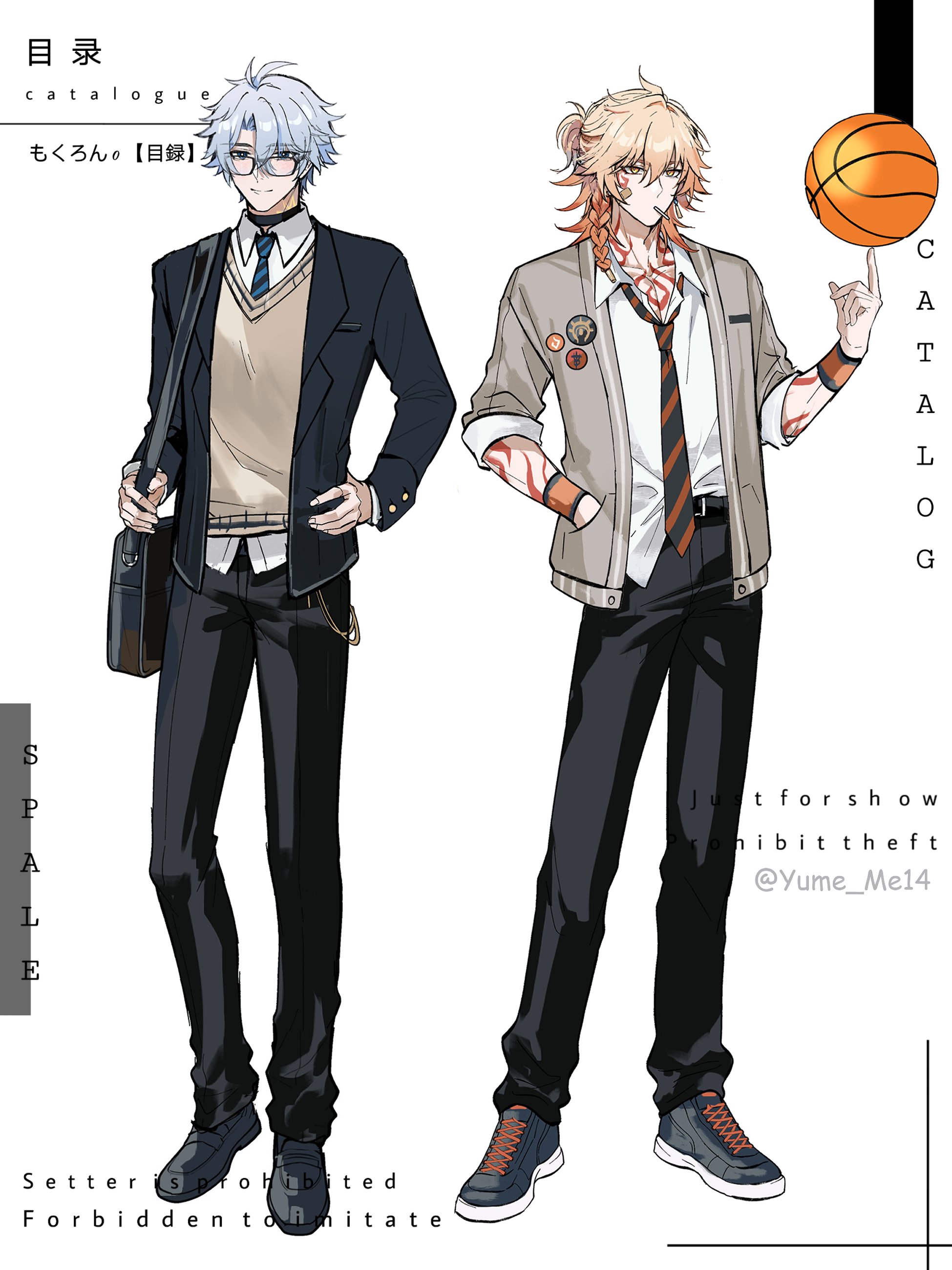 2boys absurdres antenna_hair arm_tattoo balancing_on_finger ball basketball_(object) belt black_belt black_choker black_jacket black_necktie black_pants black_tank_top blazer blonde_hair blue_eyes blue_necktie braid brown_vest chest_tattoo choker collared_shirt commentary english_commentary facial_tattoo glasses gradient_hair grey_jacket highres honkai:_star_rail honkai_(series) jacket male_focus medium_hair melucky18 multicolored_hair multiple_boys mydei_(honkai:_star_rail) neck_tattoo necktie open_clothes open_jacket pants parted_bangs phainon_(honkai:_star_rail) red_hair red_necktie red_tattoo school_uniform shirt short_hair side_braid striped_clothes striped_necktie sun_symbol sun_tattoo tachi-e tan tank_top tattoo two-tone_necktie vest watermark white_hair white_shirt yellow_eyes