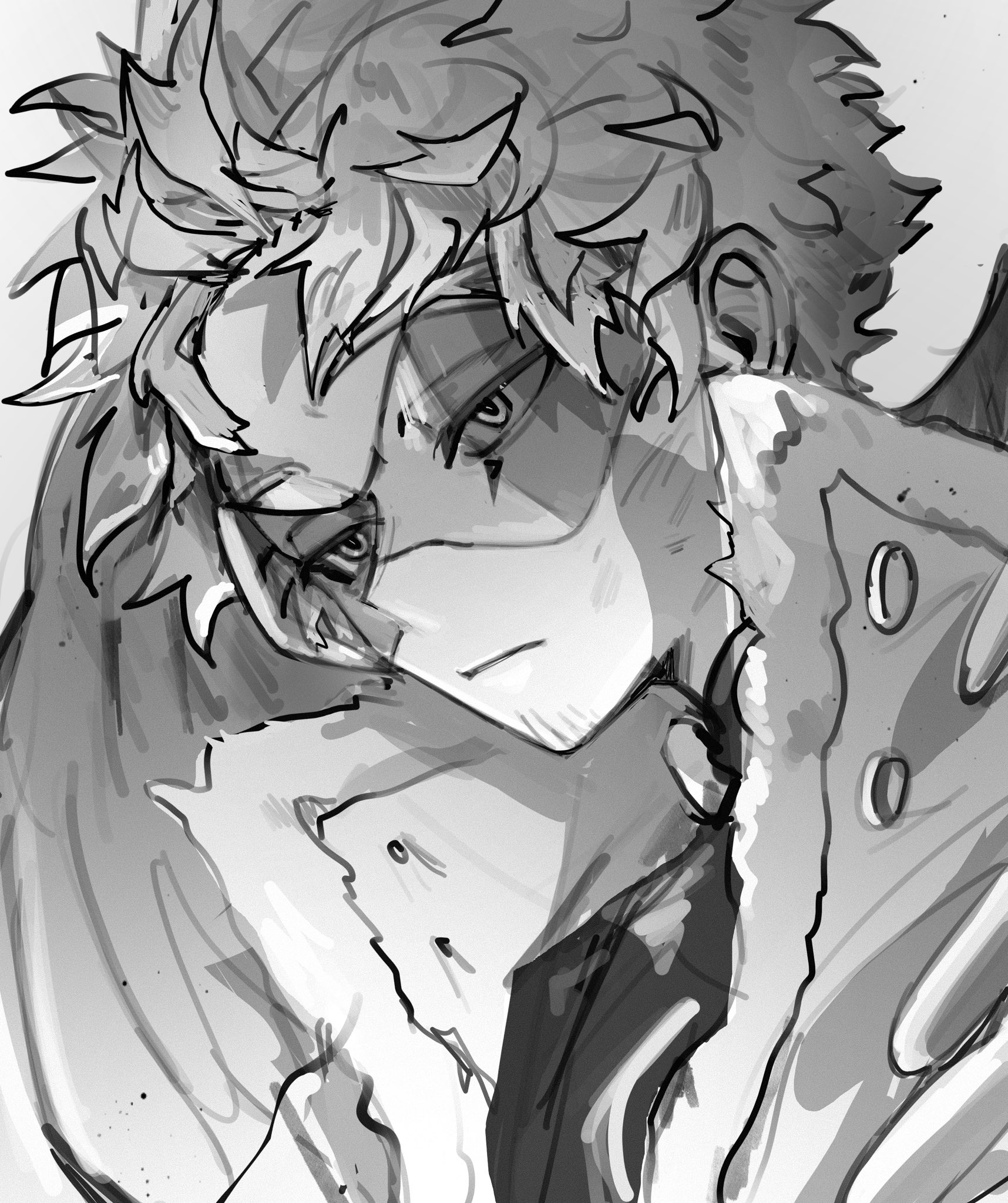 1boy boku_no_hero_academia closed_mouth commentary facial_mark goggles grey_background greyscale hawks_(boku_no_hero_academia) highres jacket looking_down male_focus monochrome open_clothes open_jacket portrait shirt short_hair sketch snowflooks solo untranslatable_commentary wings