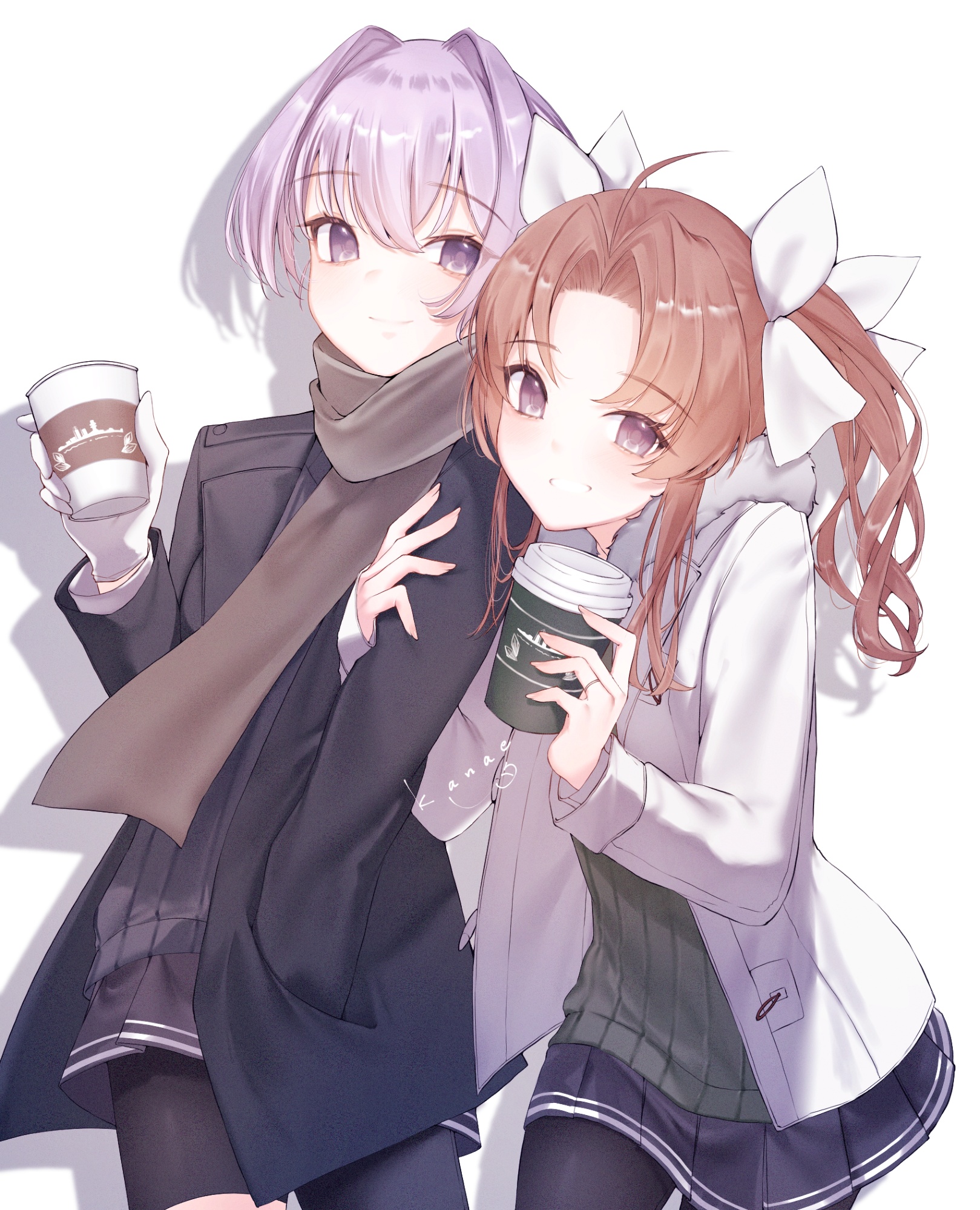 2girls adapted_costume black_coat black_pantyhose black_skirt blue_eyes brown_hair coat cup disposable_coffee_cup disposable_cup fur-trimmed_coat fur_trim grey_scarf grey_sweater hair_intakes hair_ribbon hashtag-only_commentary highres kagerou_(kancolle) kagerou_kai_ni_(kancolle) kanae_(inorin05kanae) kantai_collection multiple_girls pantyhose pink_hair pleated_skirt ponytail purple_eyes ribbon scarf shiranui_(kancolle) simple_background skirt sweater twintails white_background white_coat white_ribbon