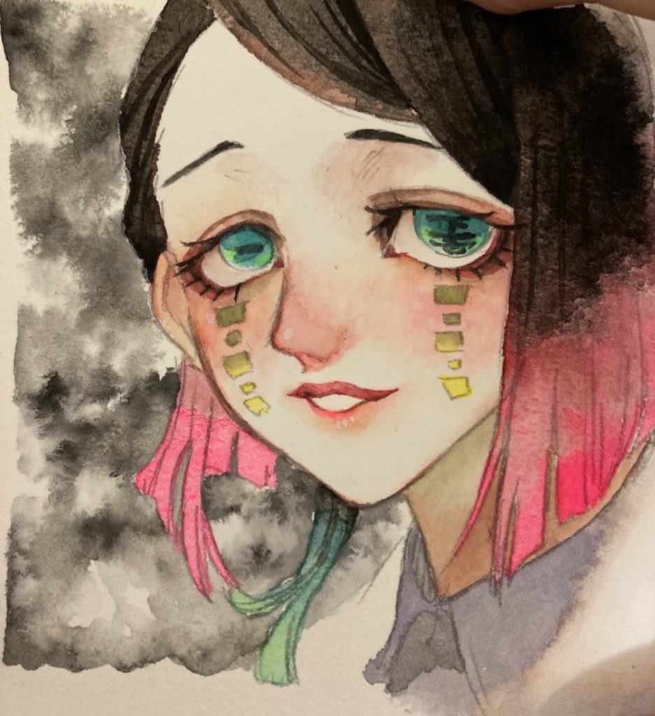 1boy artist's_hand_in_frame asymmetrical_bangs blush colored_tips commentary_request cropped_head demon_boy enmu_(kimetsu_no_yaiba) facial_mark green_eyes hatomiya_1 kimetsu_no_yaiba lips looking_at_viewer male_focus medium_hair multicolored_hair nose nose_blush parted_lips portrait red_lips sanpaku shirt solo symbol-shaped_pupils tears_facial_mark teeth traditional_media trap turning_head undershirt upturned_eyes white_shirt wing_collar