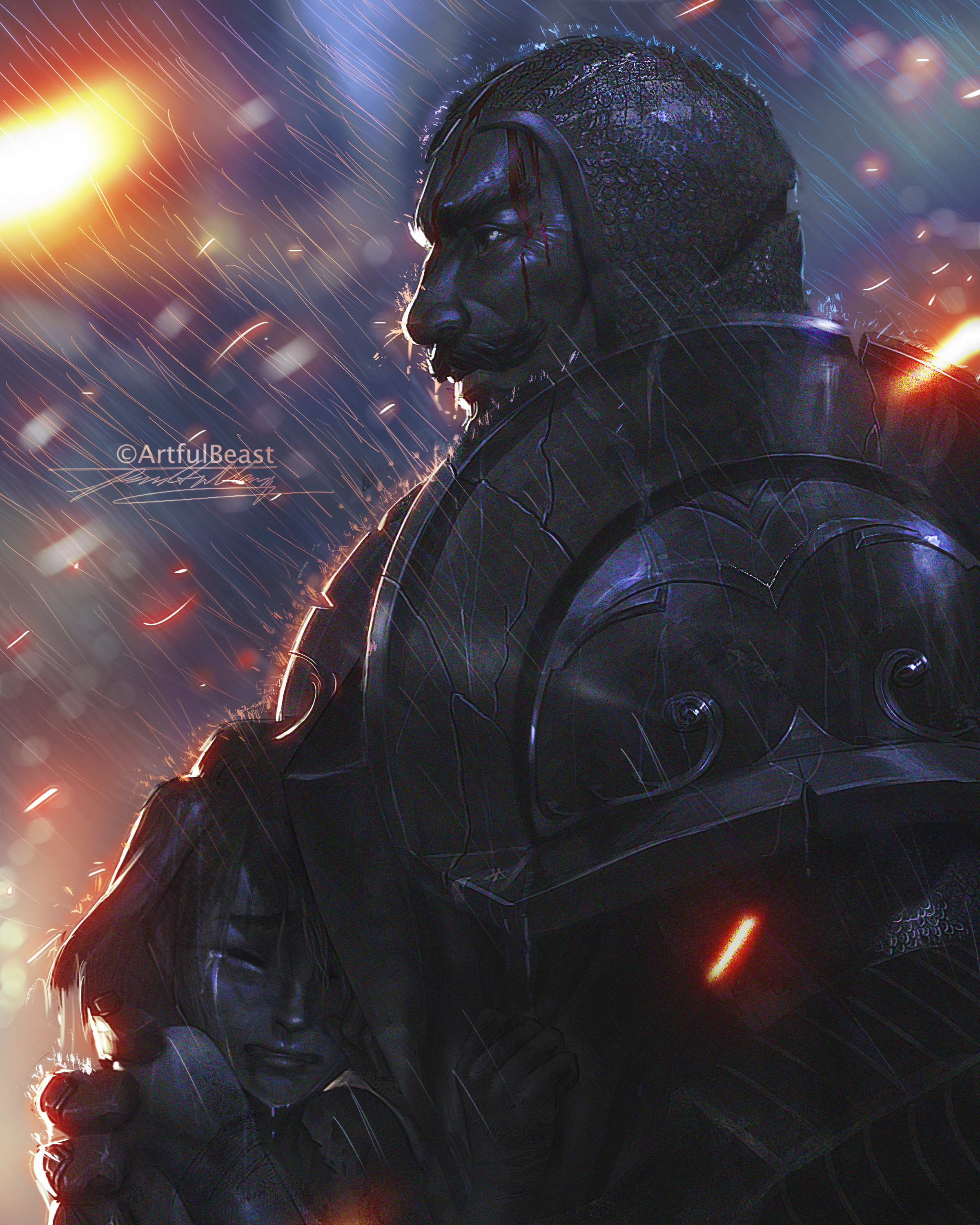 1boy 1girl absurdres armor artist_name blurry blurry_background braum_(league_of_legends) closed_eyes closed_mouth commentary crying english_commentary facial_hair from_side full_armor highres hug league_of_legends light_particles lips looking_to_the_side medium_hair mustache nose old old_man outdoors parted_lips paul_nong rain signature streaming_tears tears upper_body wet