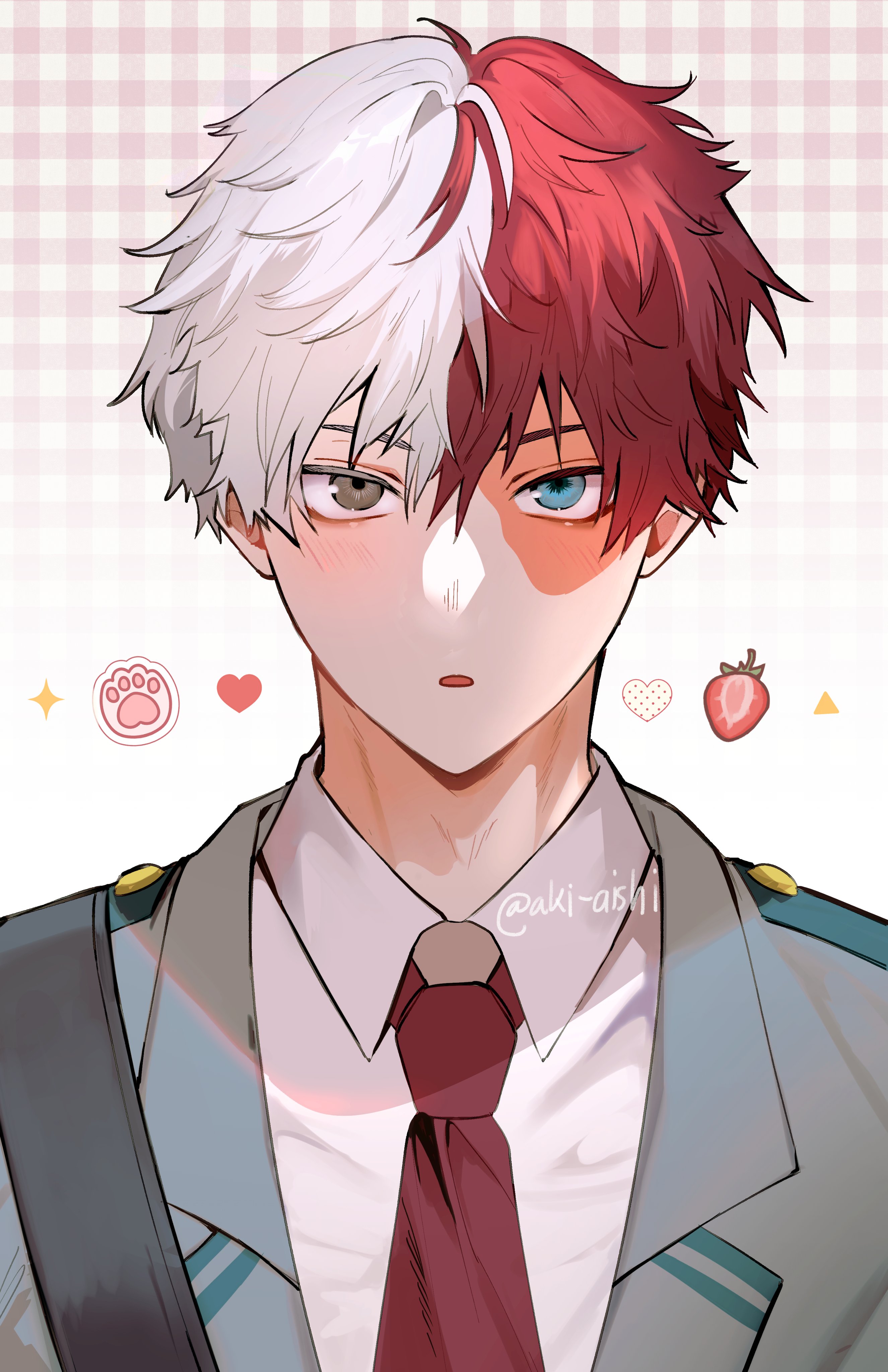 1boy absurdres akira_aishi blazer blue_eyes blush boku_no_hero_academia burn_scar collared_shirt commentary grey_eyes heterochromia highres jacket looking_at_viewer male_focus multicolored_hair necktie portrait red_hair red_necktie scar scar_on_face school_uniform shirt short_hair solo split-color_hair untranslatable_commentary todoroki_shoto twitter_username two-tone_hair u.a._school_uniform white_hair white_shirt