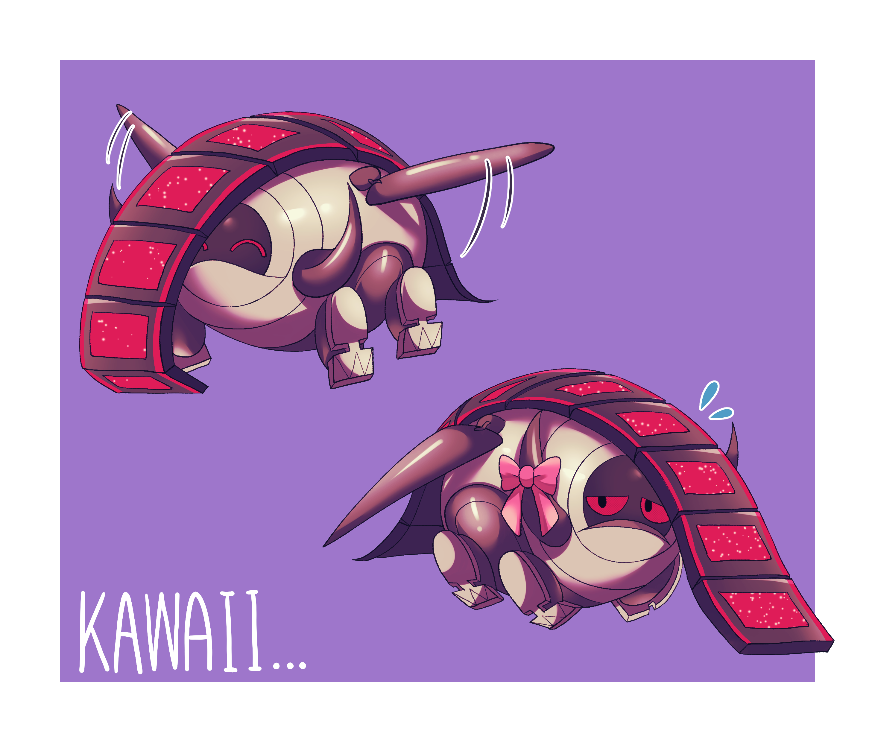 absurdres border bow commentary_request flying_sweatdrops full_body h_(user_cwtm2784) highres iron_treads motion_lines nintendo no_humans non-humanoid_robot pink_bow pokemon pokemon_(creature) pokemon_focus purple_background robot robot_animal simple_background white_border