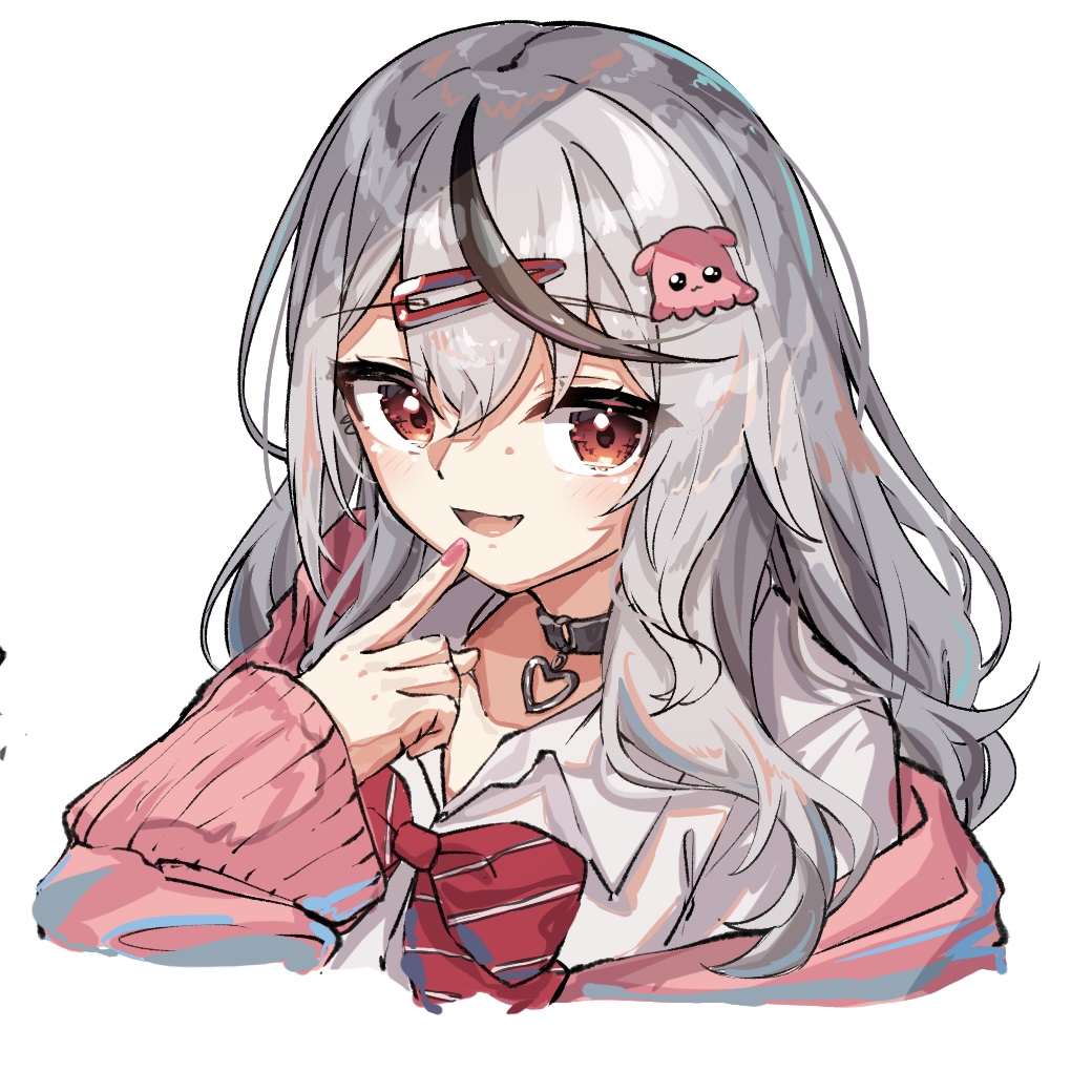 1girl black_choker black_streaks cardigan choker collared_shirt commentary_request finger_to_mouth grey_hair hair_ornament hairpin hololive long_hair multicolored_hair nail_polish official_alternate_costume official_alternate_hair_length official_alternate_hairstyle pink_cardigan pink_nails red_eyes sakamata_chloe sakamata_chloe_(gyarumata) shirt smile solo streaked_hair u_da_desu virtual_youtuber white_background white_shirt