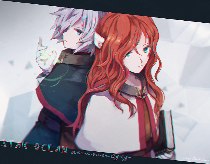 2boys book closed_mouth gabriel_(star_ocean) gloves green_eyes holding holding_book kotori_(lycka) long_hair looking_at_viewer looking_to_the_side lucifer_(star_ocean) male_focus multiple_boys red_hair robe standing star_ocean star_ocean:_the_second_story very_long_hair white_gloves