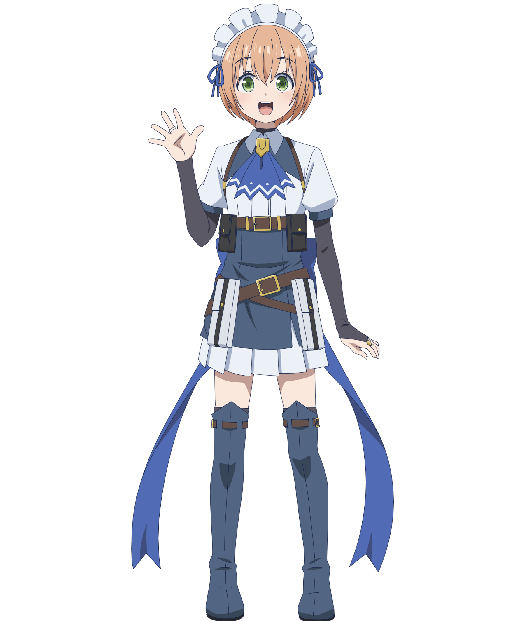 1girl :d anime_coloring arm_at_side ascot back_bow belt black_bridal_gauntlets blue_ascot blue_boots blue_bow blue_ribbon boots bow bridal_gauntlets brown_belt commentary english_commentary flat_chest full_body gigi_(kizoku_tensei) green_eyes hair_between_eyes hair_ribbon hand_up highres invisible_floor kizoku_tensei:_megumareta_umare_kara_saikyou_no_chikara_wo_eru light_blush looking_at_viewer maid maid_headdress mixed-language_commentary official_art open_hand open_mouth orange_hair pleated_skirt puffy_short_sleeves puffy_sleeves ribbon short_hair short_sleeves sidelocks simple_background skirt smile solo standing straight-on tachi-e teeth thigh_belt thigh_boots thigh_strap transparent_background upper_teeth_only waving white_skirt wing_collar