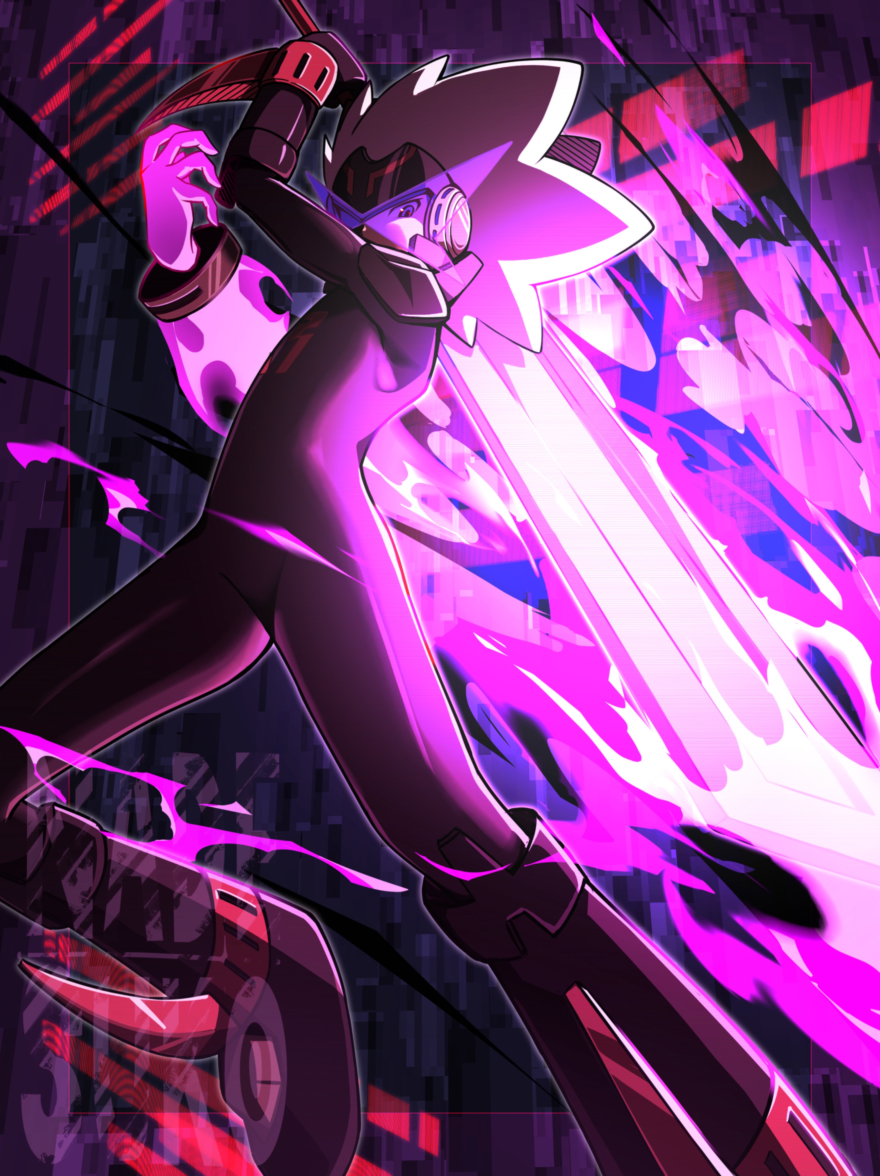 1boy absurdres black_bodysuit bodysuit commentary_request dark_background glowing grey_hair highres male_focus mega_man_(series) mega_man_star_force_(series) nadesukos purple-tinted_eyewear rogue_(mega_man) solo solo_(mega_man) tinted_eyewear