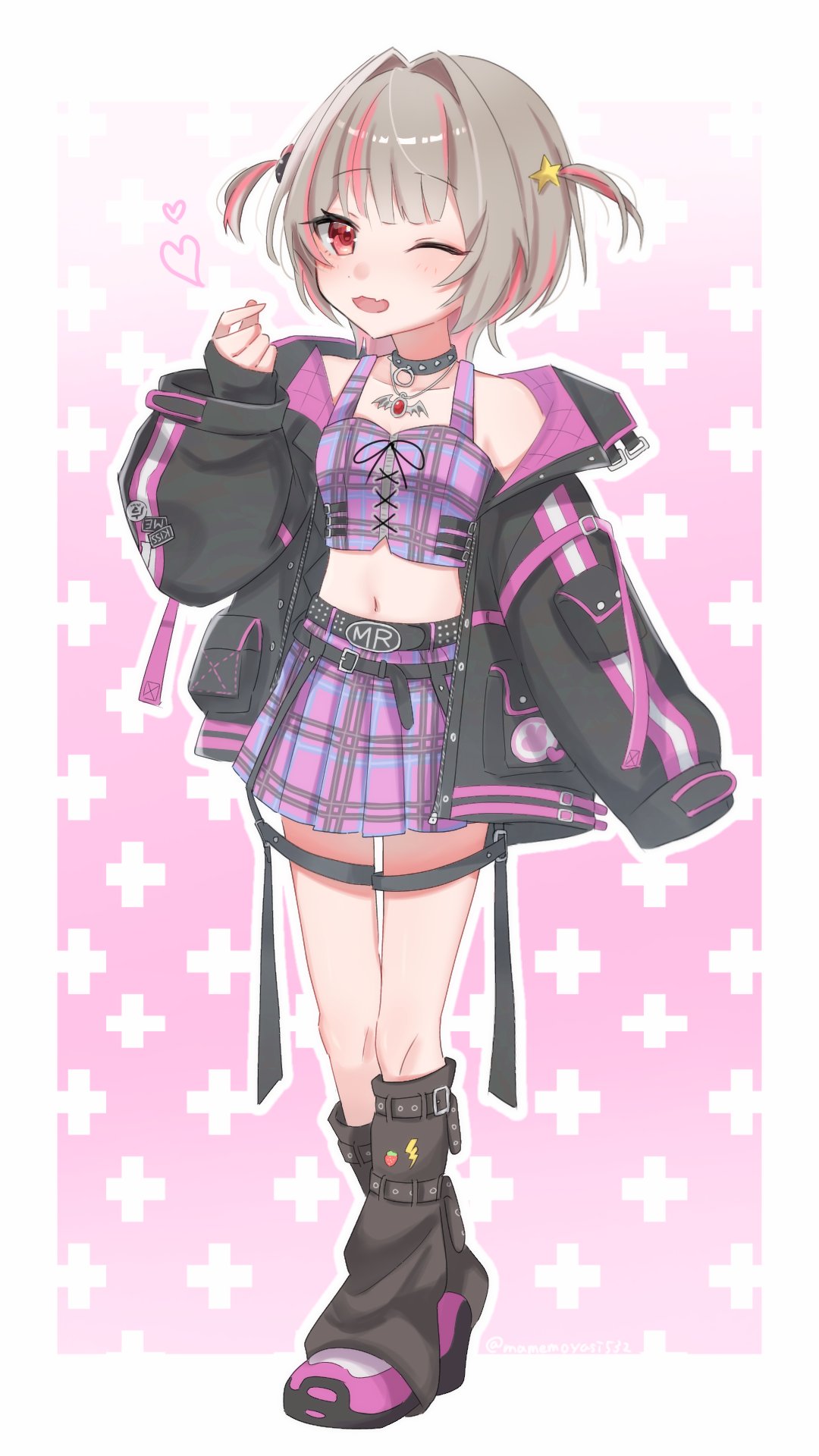 1girl ;3 arm_belt arm_warmers bat_necklace belt belt_buckle black_arm_warmers black_belt black_collar black_jacket black_leg_warmers black_straps blunt_bangs blush border buckle chain chain_necklace clothes_writing collar collarbone colored_inner_hair commentary_request crop_top cross-laced_clothes cross-laced_top fang finger_heart food_print fruit_print full_body gradient_background grey_hair hair_intakes hair_ornament hand_up heart highres jacket jewelry leg_belt leg_warmers lightning_bolt_print looking_at_viewer loose_belt makaino_ririmu makaino_ririmu_(6th_costume) mamemoyasi532 midriff miniskirt multicolored_hair multicolored_hair_bobbles multiple_belts navel necklace nijisanji missing_headwear o-ring o-ring_collar o-ring_thigh_strap one_eye_closed open_clothes open_jacket open_mouth pendant pink_background pink_belt pink_hair pink_jacket pink_shoes pink_skirt pink_streaks plaid_clothes plaid_skirt pleated_skirt pocket red_eyes shoes short_hair skin_fang skirt sleeves_past_fingers sleeves_past_wrists solo spiked_collar spikes standing star_(symbol) star_hair_ornament strawberry_print streaked_hair studded_belt thigh_strap twitter_username two-sided_fabric two-sided_jacket two-tone_hair two_side_up unbuttoned unzipped virtual_youtuber white_border wolf_cut zipper_top