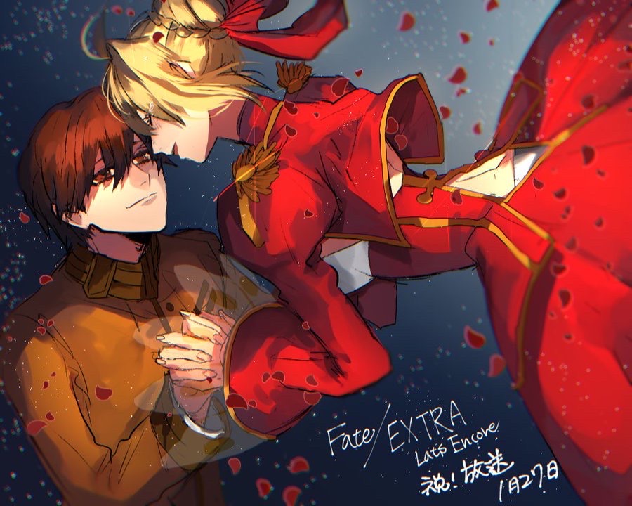 1boy 1girl ahoge back_cutout blonde_hair brown_eyes brown_hair brown_jacket clothing_cutout commentary_request copyright_name dress fate/extra fate/extra_last_encore fate_(series) hair_between_eyes holding_hands jacket kishinami_hakuno_(male) nero_claudius_(fate) nero_claudius_(fate/extra) ou_syoku7 petals red_dress red_ribbon ribbon short_hair translation_request