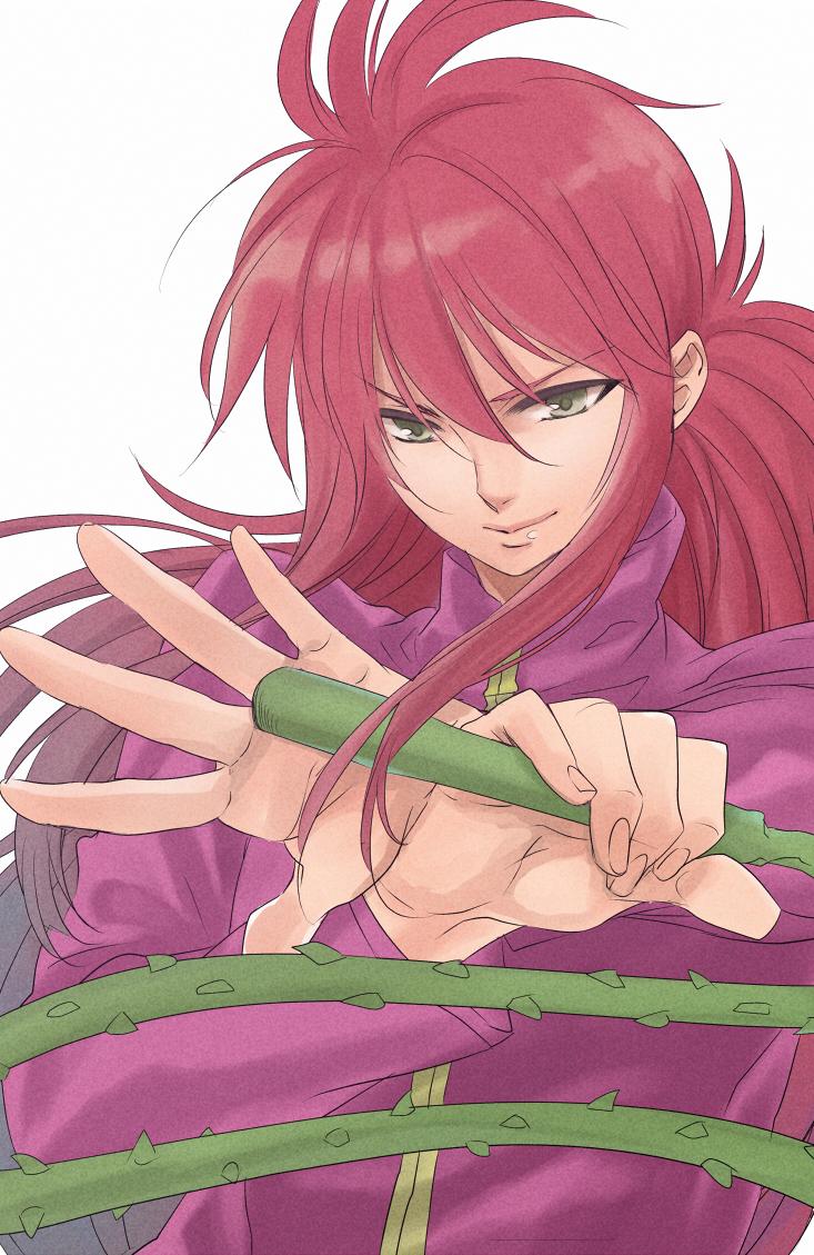 1boy commentary_request green_eyes hachiya_nanao holding holding_whip jacket kurama_(yu_yu_hakusho) lips long_hair male_focus purple_jacket red_hair smile solo thorns upper_body yuu_yuu_hakusho