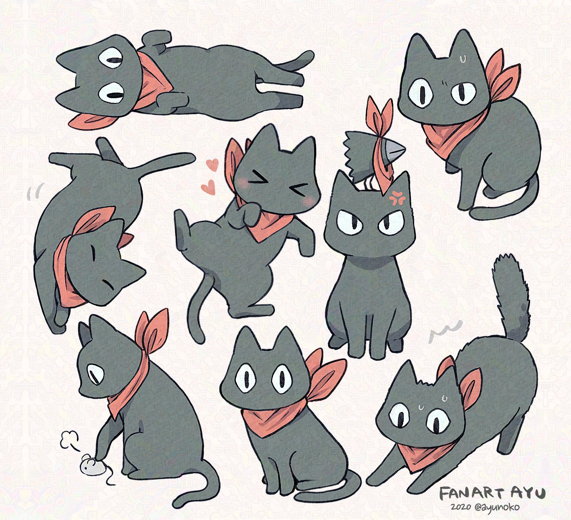 >_< :3 =_= ^^^ anger_vein animal animal_focus artist_name ayu_(mog) black_cat blush cat closed_eyes commentary_request crow_(nichijou) highres lying mouse_(animal) neckerchief nichijou no_humans no_mouth o_o on_side puff_of_air red_scarf sakamoto_(nichijou) scarf signature simple_background tail
