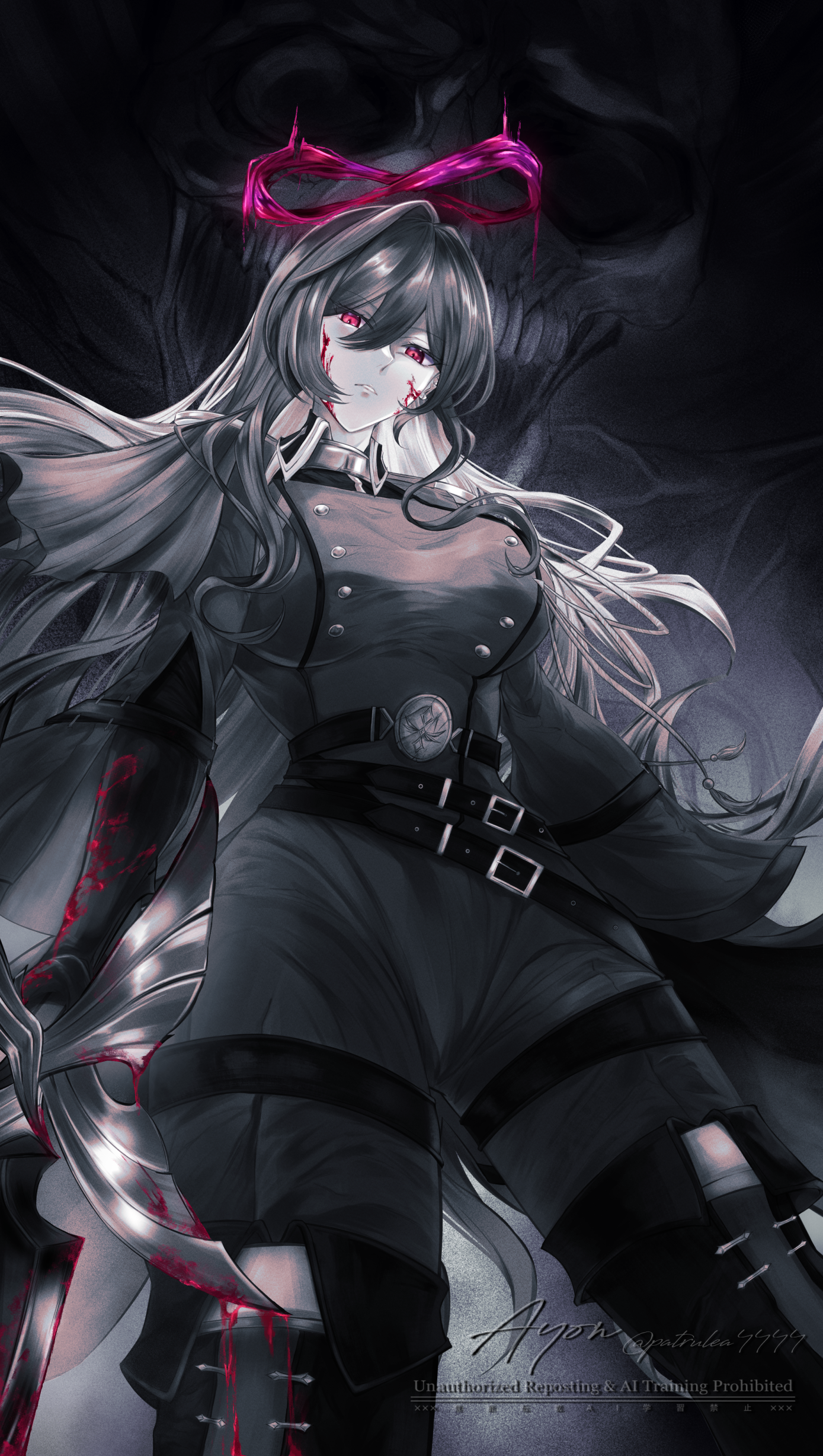 1girl absurdres ayon_(patrulea4444) belt black_gloves blood blood_on_face boots breasts buttons closed_mouth commentary cowboy_shot double-breasted duel_monster earrings exosister_karmael exosister_martha gloves greyscale hair_between_eyes halo highres holding holding_sword holding_weapon jacket jewelry large_breasts limited_palette long_hair long_sleeves looking_at_viewer military_jacket monochrome pants red_eyes sidelocks signature skull solo standing sword taut_clothes thigh_belt thigh_boots thigh_strap very_long_hair watermark weapon yu-gi-oh!