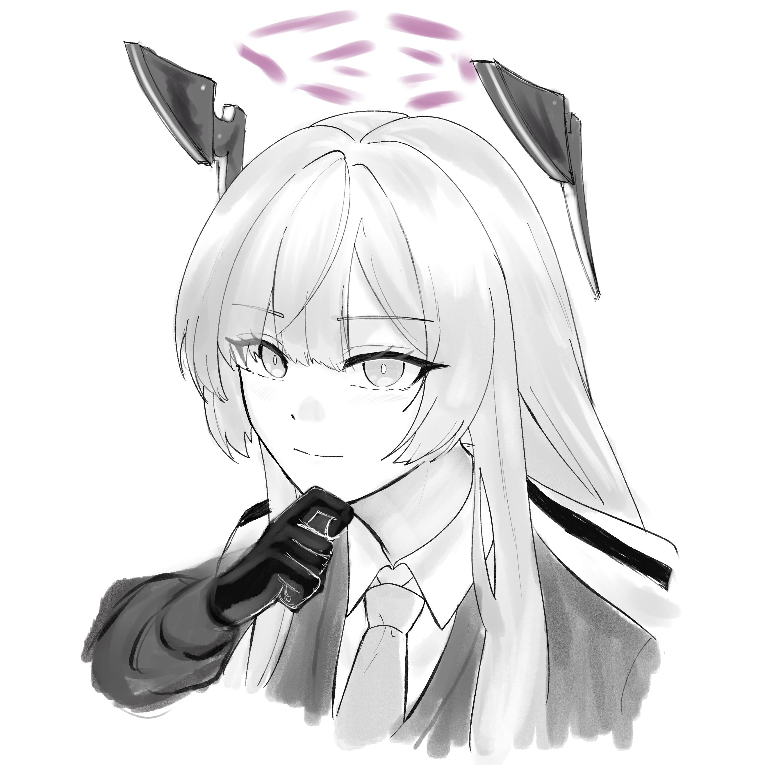 1girl absurdres blue_archive coat coat_on_shoulders collared_shirt commentary_request eyes_visible_through_hair gloves greyscale hair_between_eyes hair_over_one_eye halo hand_on_own_chin highres jacket_suit long_hair long_sidelocks looking_at_viewer m1i_i109 mechanical_ears monochrome necktie purple_halo shirt sidelocks solo spot_color upper_body utaha_(blue_archive) white_background