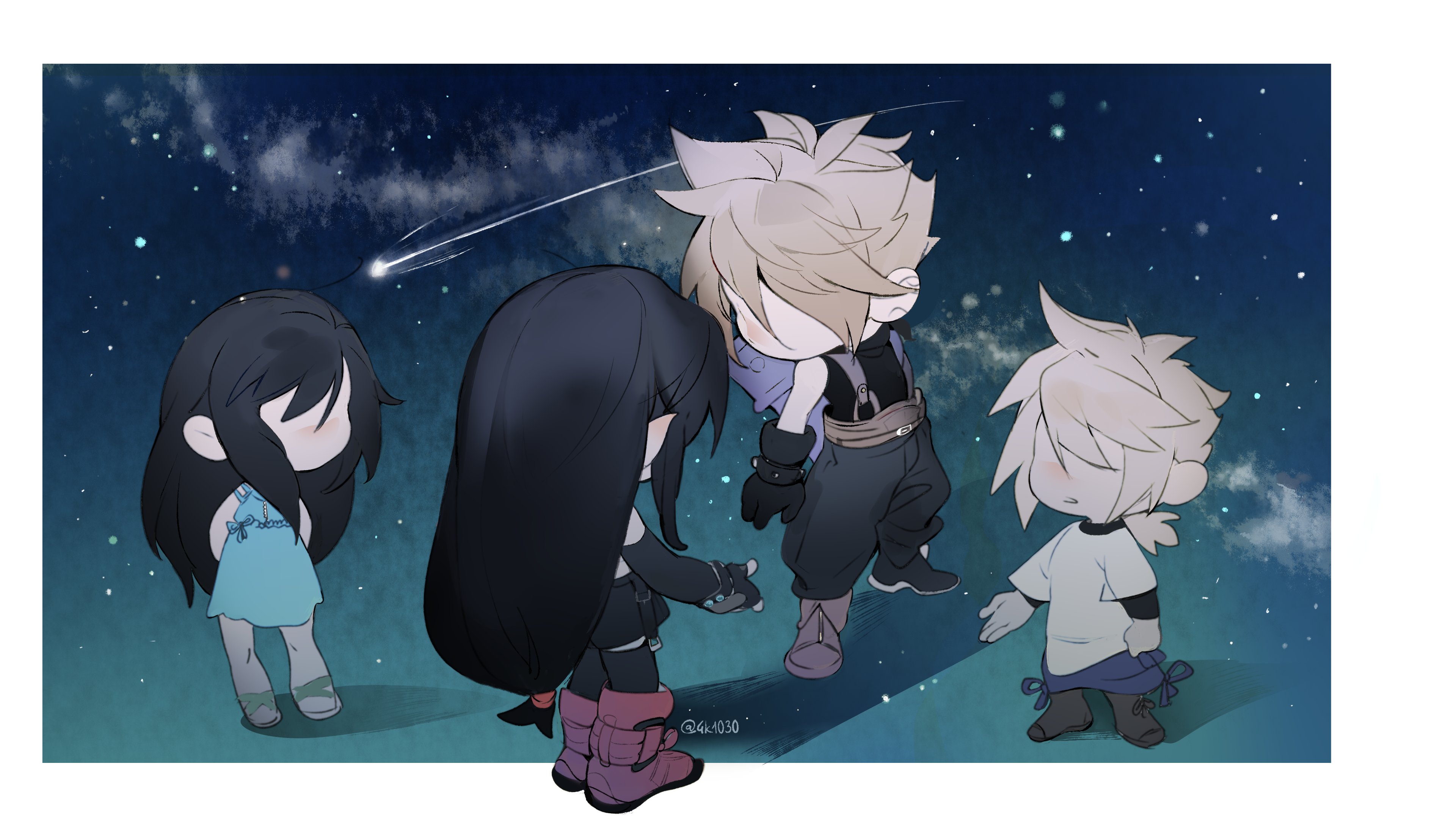 1boy 1girl 4k1030 absurdres aged_down aqua_dress baggy_pants bare_shoulders black_gloves black_hair black_pants black_skirt black_thighhighs blonde_hair boots border bracelet buster_sword cloud_strife dress elbow_gloves faceless faceless_female faceless_male facing_another final_fantasy final_fantasy_vii final_fantasy_vii_remake gloves highres jewelry long_hair low-tied_long_hair low_ponytail materia night outside_border pants ponytail red_boots sandals shirt shooting_star short_hair skirt sky sleeveless sleeveless_turtleneck spiked_hair standing star_(sky) starry_sky suspenders sweater sword sword_on_back t-shirt thighhighs tifa_lockhart turtleneck turtleneck_sweater twitter_username weapon weapon_on_back white_border white_shirt