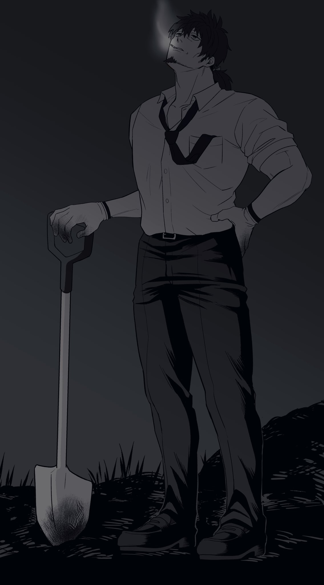 1boy belt cheekbones cigarette collared_shirt commentary_request facial_hair fate/grand_order fate_(series) full_body gloves goatee greyscale hands_in_pockets haruto_(hit23ewluvnpfo6) hector_(fate) highres looking_up male_focus mature_male monochrome necktie_in_pocket pants planted planted_shovel ponytail shirt shoes shovel smoking solo