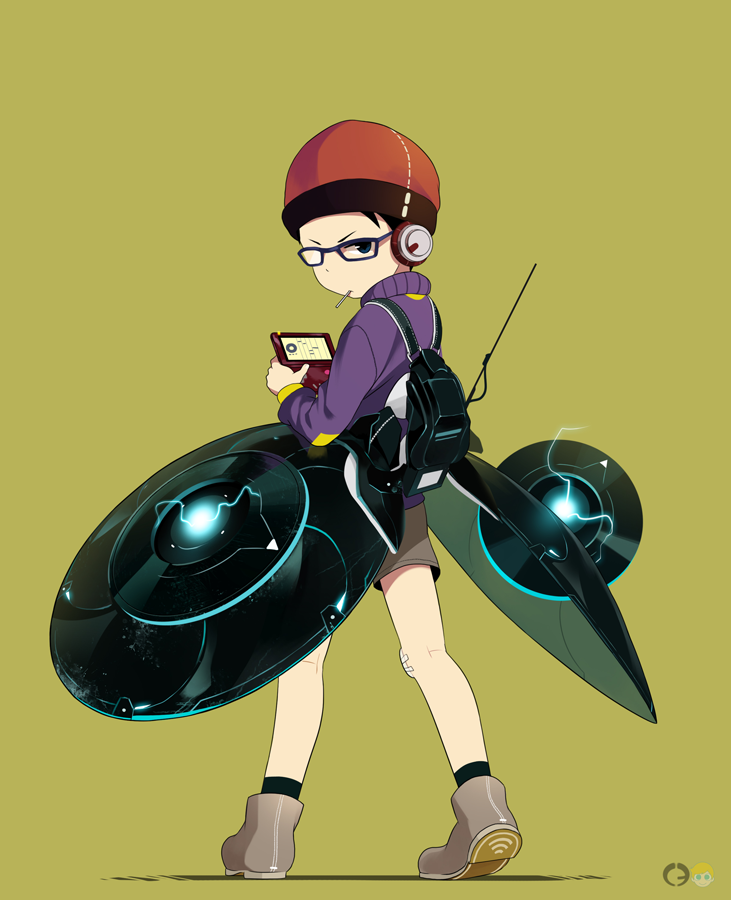 1boy backpack bag beanie black_hair blue-framed_eyewear blue_eyes boots brown_boots brown_shorts child commentary_request from_behind frown full_body glasses green_background handheld_game_console hat headphones holding holding_handheld_game_console long_sleeves looking_at_viewer looking_back male_focus noeyebrow_(mauve) original purple_sweater red_hat serious shorts simple_background solo standing sweater