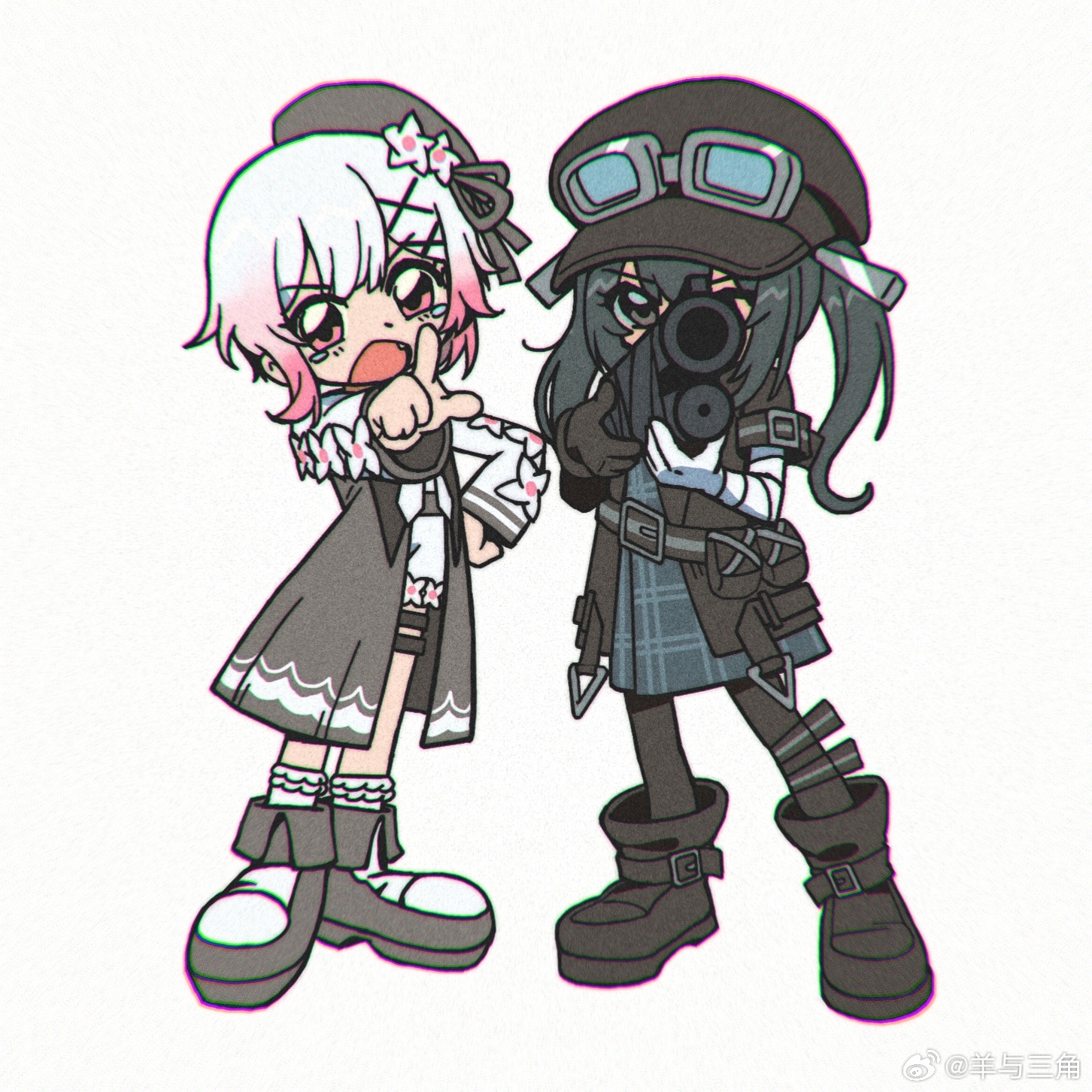 2girls aiming ammunition_pouch bandaged_arm bandages beret black_boots black_hair black_hat black_jacket boots chinese_commentary commentary_request dress fang flower full_body goggles goggles_on_headwear grey_dress gun hair_flower hair_ornament hand_on_own_hip hat highres holding holding_gun holding_weapon jacket kurobe_nanoka long_hair long_sleeves looking_at_viewer mahou_shoujo_no_majo_saiban multicolored_hair multiple_girls open_mouth pink_eyes pink_hair pointing pointing_at_viewer pouch retro_artstyle sakuraba_ema short_hair simple_background standing tearing_up watermark weapon weibo_watermark white_background white_hair x_hair_ornament yang_yu_sanjiao