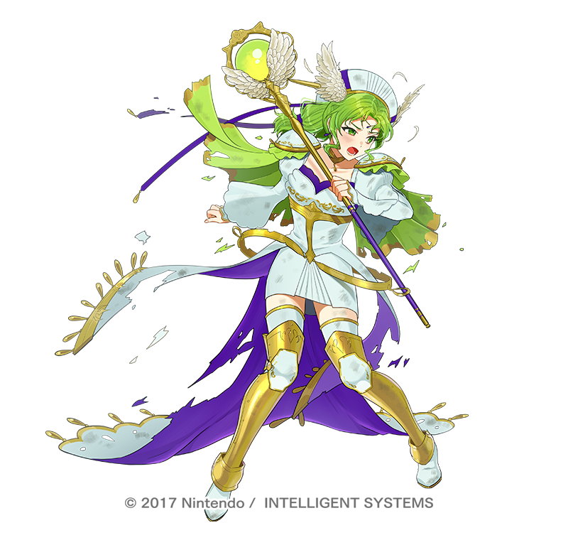 1girl boots cape commentary_request damaged dress fire_emblem fire_emblem:_the_sacred_stones fire_emblem_heroes green_cape green_eyes green_hair high_heel_boots high_heels holding holding_staff l'arachel_(fire_emblem) l'arachel_(justice-armed)_(fire_emblem) nintendo official_alternate_costume official_art open_mouth shoulder_pads solo staff thighhighs torn_cape torn_clothes transparent_background tsukana_(saba_mizore) v-shaped_eyebrows valkyrie white_dress