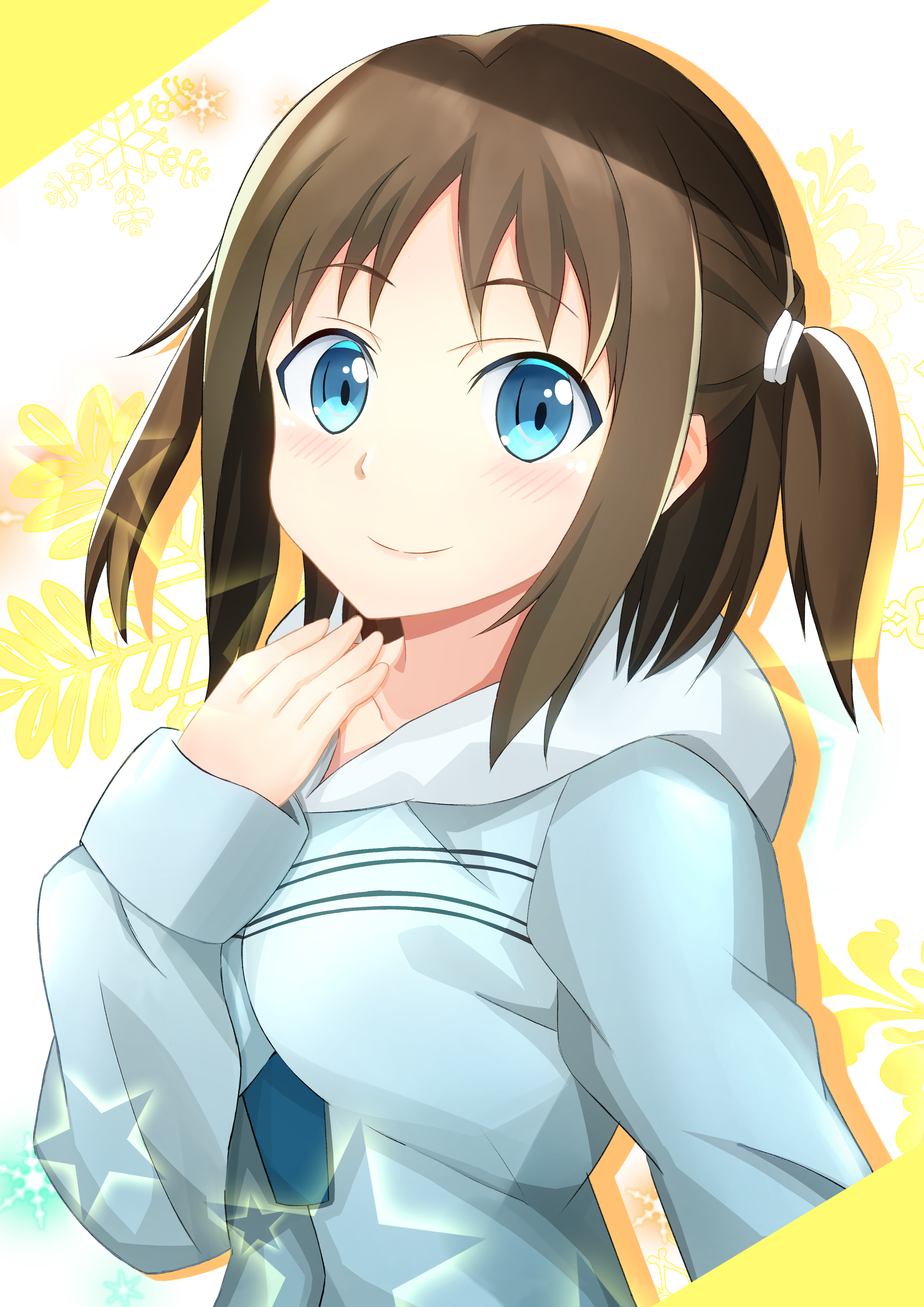 1girl abstract_background absurdres blue_eyes blue_hoodie blush breasts brown_hair collarbone commentary_request hand_up highres hood hood_down hoodie kyabetsu_ningen long_sleeves looking_at_viewer medium_breasts medium_hair ronye_arabel short_twintails sidelocks smile solo star_(symbol) sword_art_online sword_art_online:_alicization twintails two-tone_background upper_body white_background yellow_background