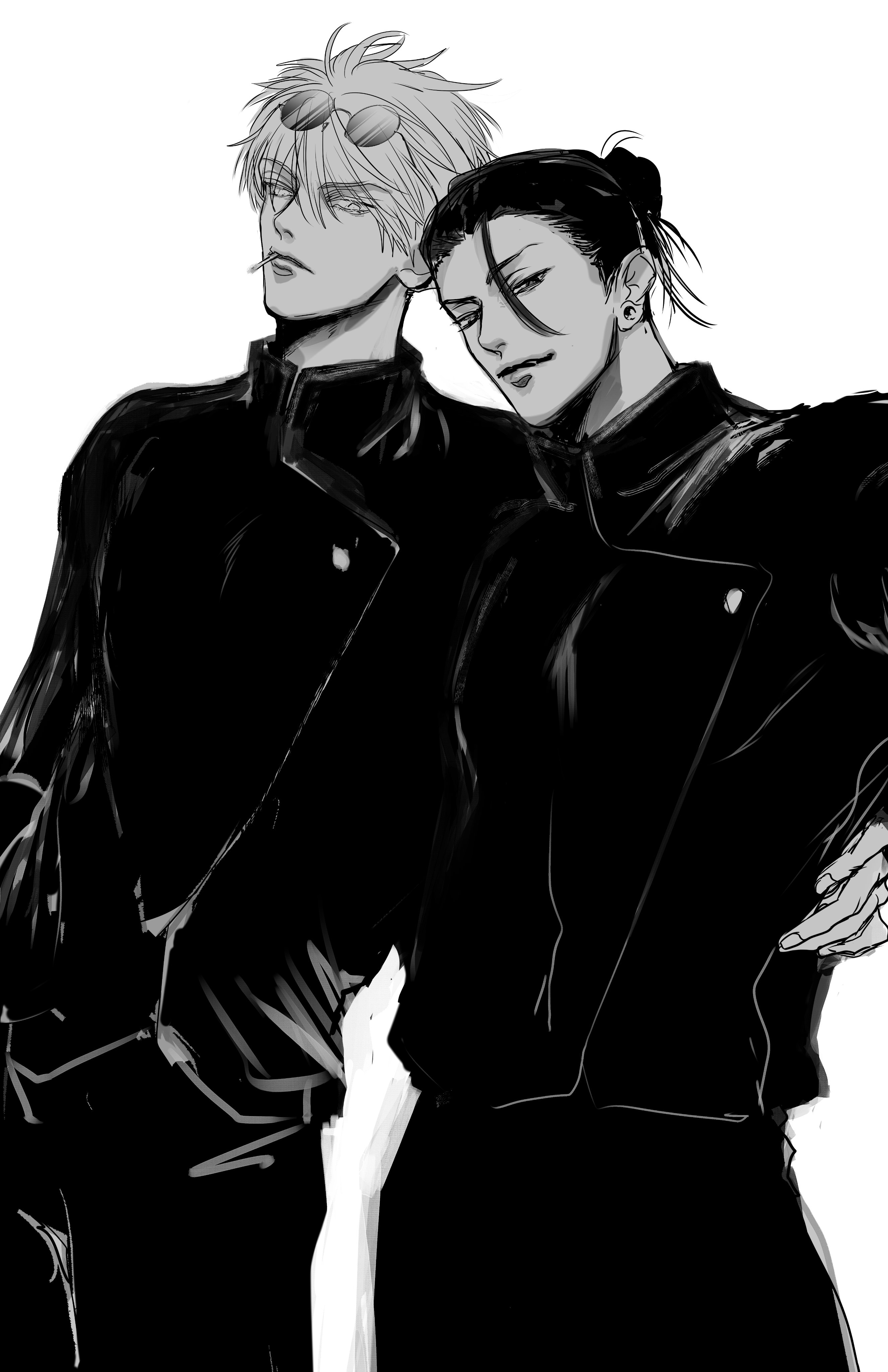 2boys absurdres buttons closed_mouth commentary_request eyewear_on_head food_in_mouth geto_suguru gojo_satoru greyscale hand_on_another's_waist height_difference highres iku_ju jujutsu_kaisen jujutsu_tech_uniform lollipop_in_mouth looking_at_viewer male_focus monochrome multiple_boys round_eyewear short_hair simple_background white_background