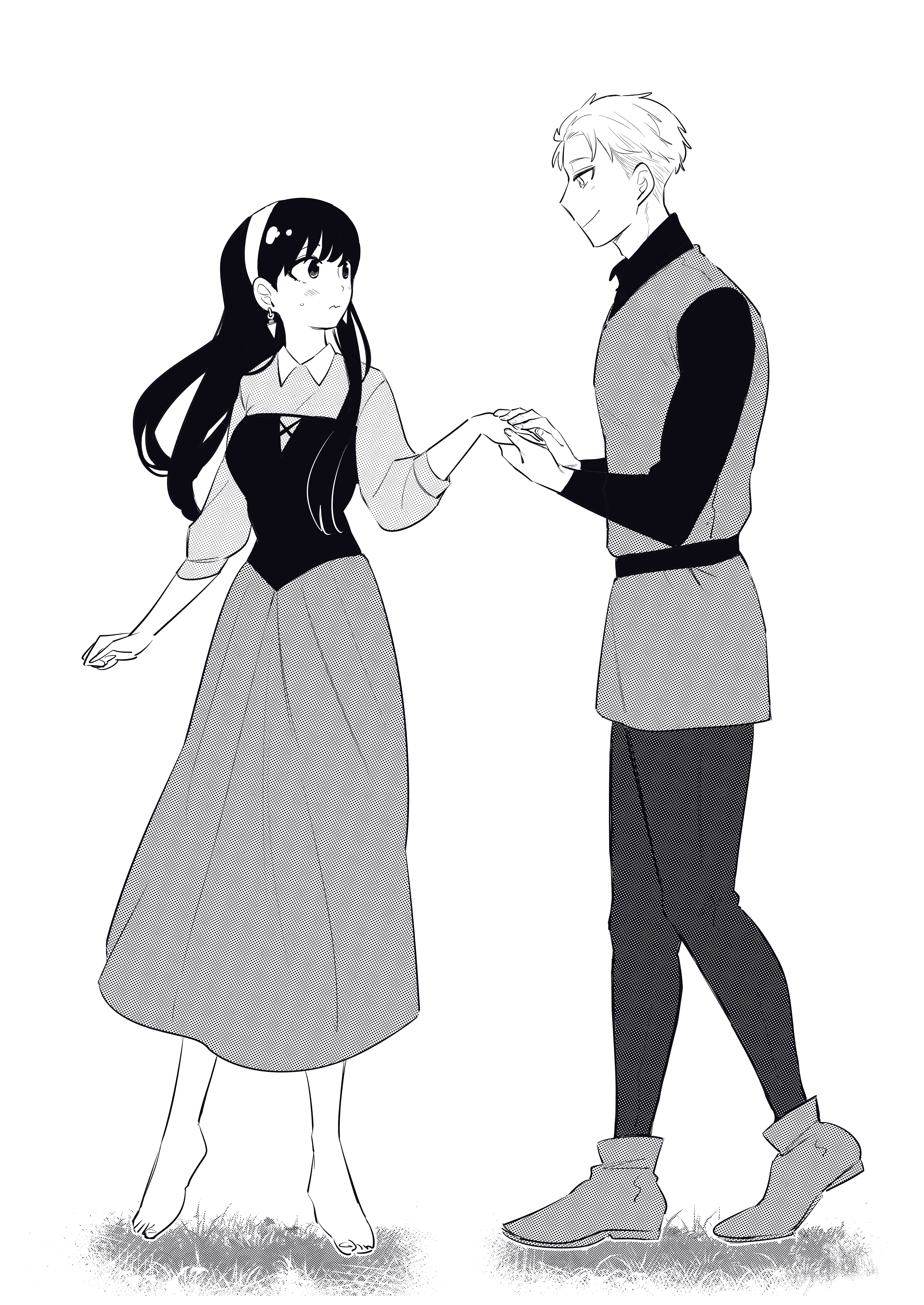 1boy 1girl absurdres ayuhata_toba barefoot belt ben-day_dots blush bodice breasts closed_mouth collared_shirt commentary_request dress full_body grass greyscale hairband hetero highres holding_hands long_hair long_sleeves looking_at_another medium_breasts monochrome pants profile screentones shirt shoes short_hair simple_background smile spy_x_family standing tiptoes tunic twilight_(spy_x_family) white_background yor_briar
