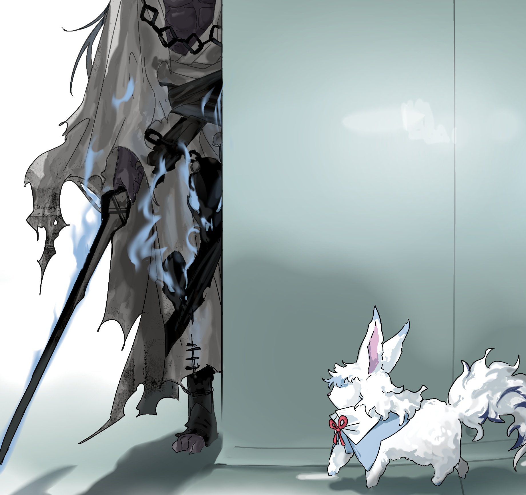 azrael_(grand_assassin)_(fate) barefoot blue_fire bow chain colored_skin commentary_request fate/grand_order fate_(series) fire fou_(fate) grey_skin hallway head_out_of_frame highres holding holding_sword holding_weapon ilpal161760 korean_commentary long_hair muscular muscular_male no_eyes red_bow sword torn_clothes very_long_hair weapon