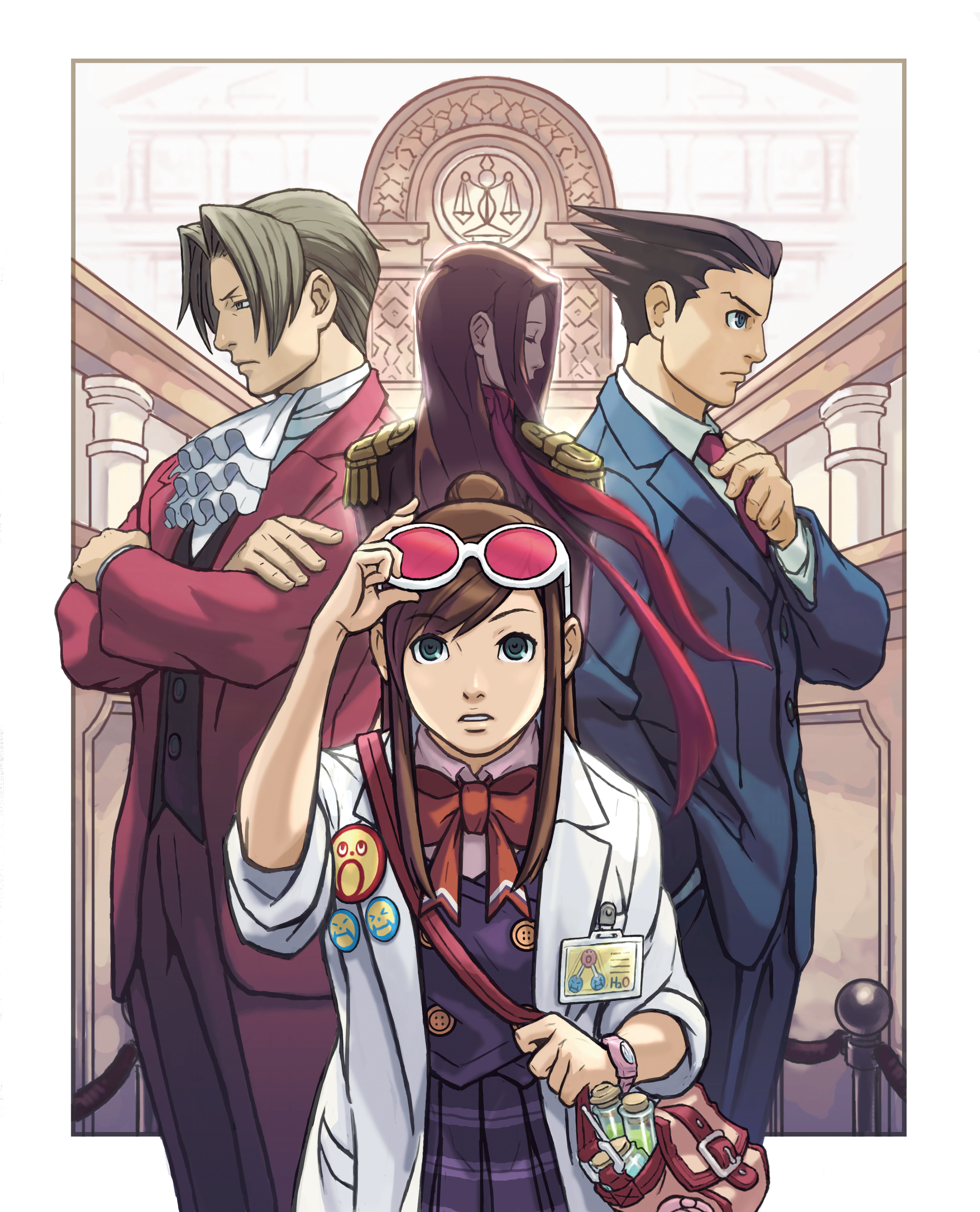 2boys 2girls absurdres ace_attorney bag bow brown_hair commentary courtroom crossed_arms ema_skye english_commentary eyewear_on_head glasses hand_in_pocket highres lab_coat lana_skye miles_edgeworth multiple_boys multiple_girls necktie nuri_kazuya official_art phoenix_wright phoenix_wright:_ace_attorney third-party_source watch wristwatch