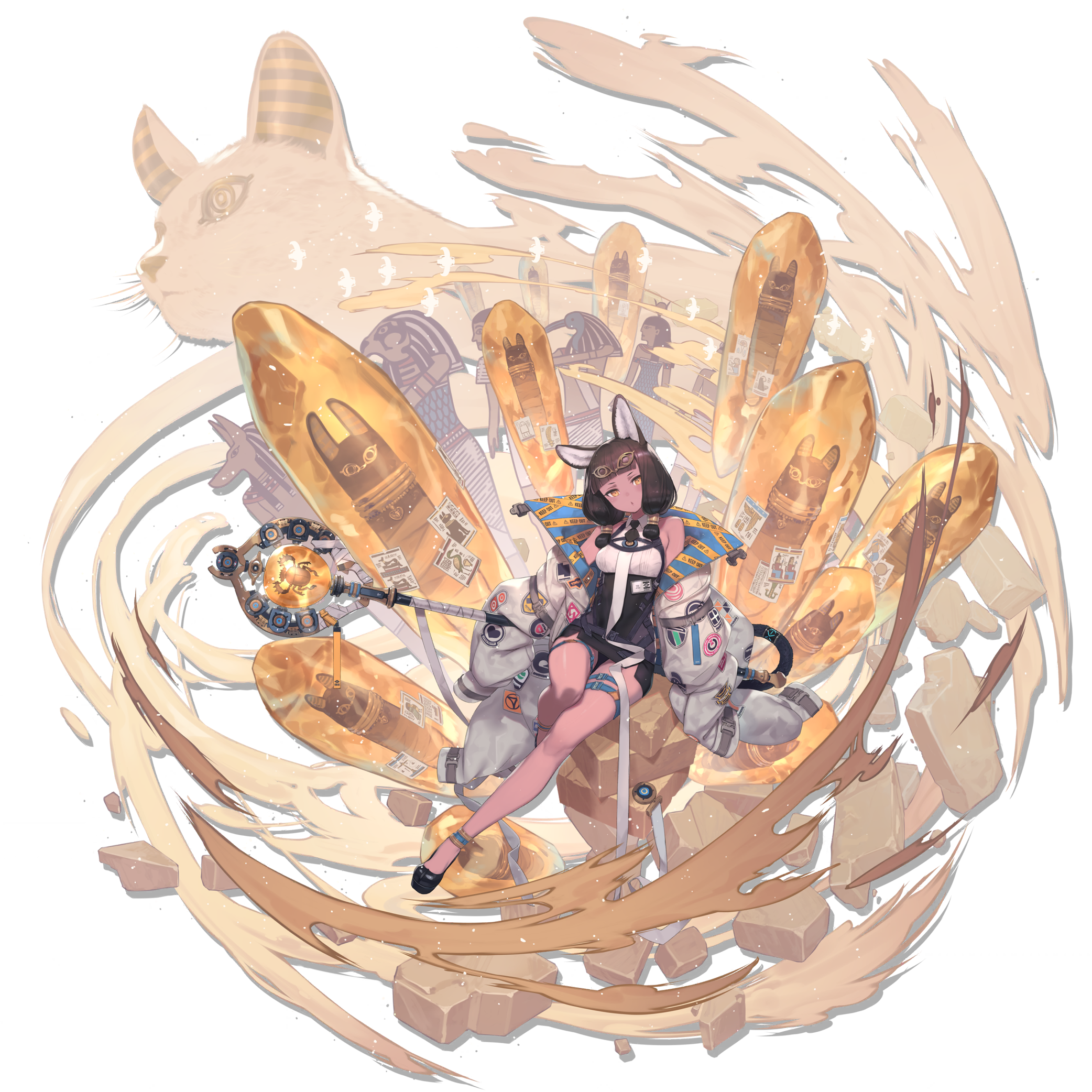 1girl :o amber_(gemstone) ancient_egyptian animal_ear_fluff animal_ears anklet anubis_(mythology) arknights bandages bare_legs beetle belt black_belt black_dress black_hair black_necktie black_shoes blue_belt blunt_bangs brick brown_theme bug cat cat_ears cat_girl cat_tail caution_tape collared_shirt dark-skinned_female dark_skin dress egyptian_mythology english_text flying framed_breasts full_body gem grey_belt hathor_(mythology) heart high_collar highleg highleg_dress highres holding holding_staff horus_(mythology) id_card insect jacket jewelry keep_out knees_together_feet_apart kuroboshi_kouhaku long_sleeves looking_at_viewer medium_hair miniskirt mio_(beast_lord)_(arknights) multiple_belts mummy necktie official_art open_clothes open_jacket open_mouth oversized_jacket pocket sand shirt shoes short_necktie simple_background sitting skirt sleeve_belt sleeveless sleeveless_shirt solo staff standing tachi-e tail taped_note thigh_belt thigh_strap third-party_source thoth_(mythology) titi_(arknights) transparent_background white_jacket white_shirt yellow_belt yellow_eyes
