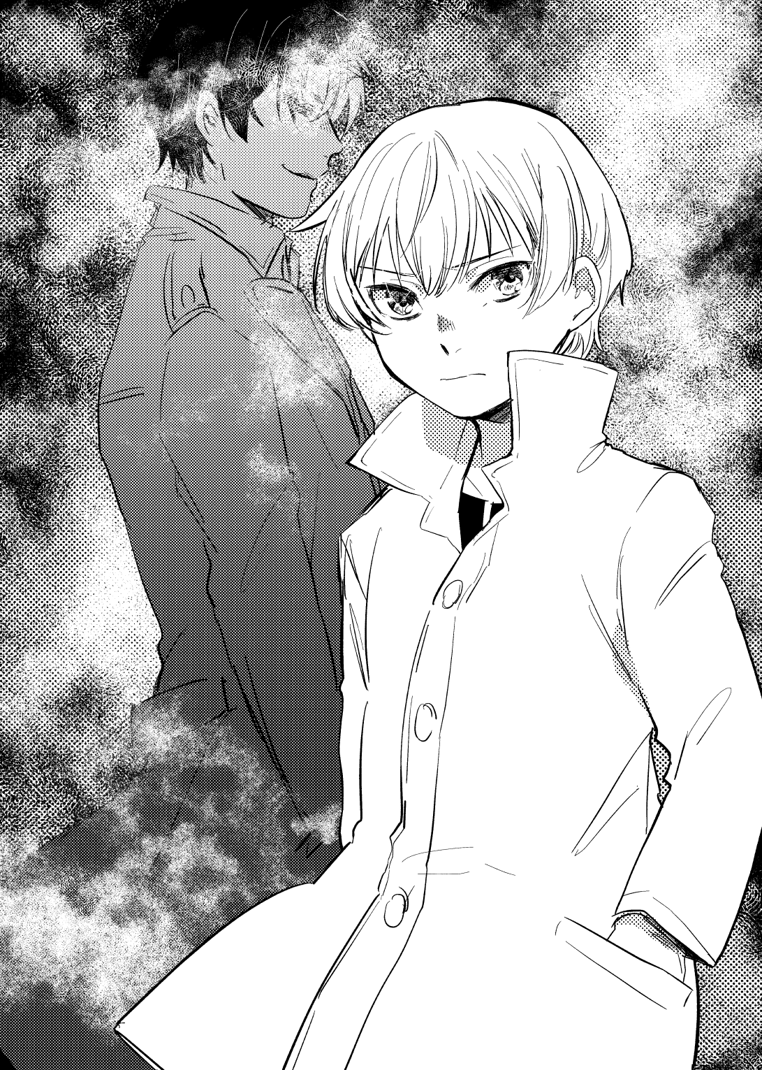2boys boku_dake_ga_inai_machi closed_mouth coat commentary_request evil_smile greyscale hands_in_pockets highres kobayashi_kenya long_sleeves male_focus monochrome multiple_boys school_uniform serious short_hair smile spoilers tkj_(0_x_x) yashiro_gaku