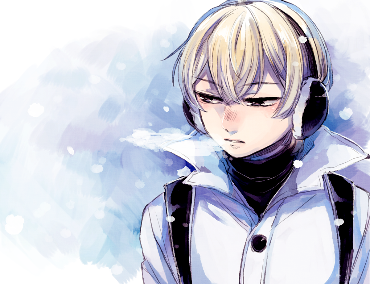 1boy backpack bag black_sweater blonde_hair boku_dake_ga_inai_machi breath commentary_request earmuffs grey_jacket jacket kobayashi_kenya male_focus parted_lips short_hair snowing solo sweater tkj_(0_x_x) turtleneck turtleneck_sweater white_background
