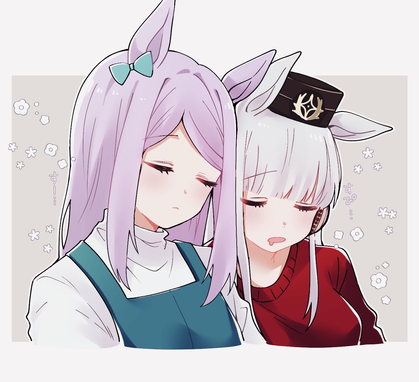2girls animal_ears aqua_dress blunt_bangs bow breasts casual closed_eyes closed_mouth dress drooling ear_bow ear_ribbon gold_ship_(umamusume) grey_hair highres horse_ears horse_girl long_hair long_sleeves medium_breasts mejiro_mcqueen_(casual)_(umamusume) mejiro_mcqueen_(umamusume) mouth_drool multiple_girls open_mouth pillbox_hat purple_hair red_sweater ribbon segawa_rui shirt sleeping sweater umamusume white_shirt