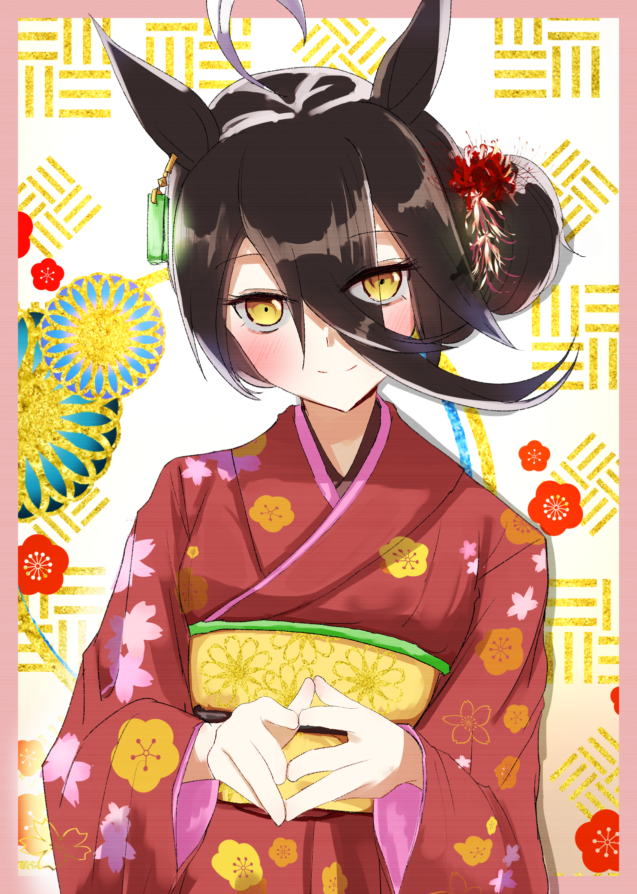 1girl ahoge alternate_costume alternate_hairstyle animal_ears black_hair blush closed_mouth ear_tag earrings floral_print floral_print_kimono flower hair_between_eyes hair_bun hair_flower hair_ornament highres horse_ears horse_girl japanese_clothes jewelry kimono long_bangs long_hair long_hair_between_eyes long_sleeves looking_at_viewer manhattan_cafe_(umamusume) multicolored_hair obi print_kimono red_kimono sash single_earring smile solo umamusume umayonyosi white_hair yellow_eyes