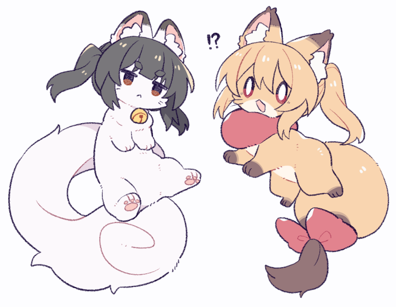 !? :< animal animal_ear_fluff animal_focus bell black_hair blonde_hair blunt_bangs bow brown_eyes double-parted_bangs fox hair_between_eyes jitome neck_bell no_humans open_mouth original ponytail red_bow red_eyes short_hair suzuno_(suzuno3110) tail tail_bow tail_ornament thick_eyebrows