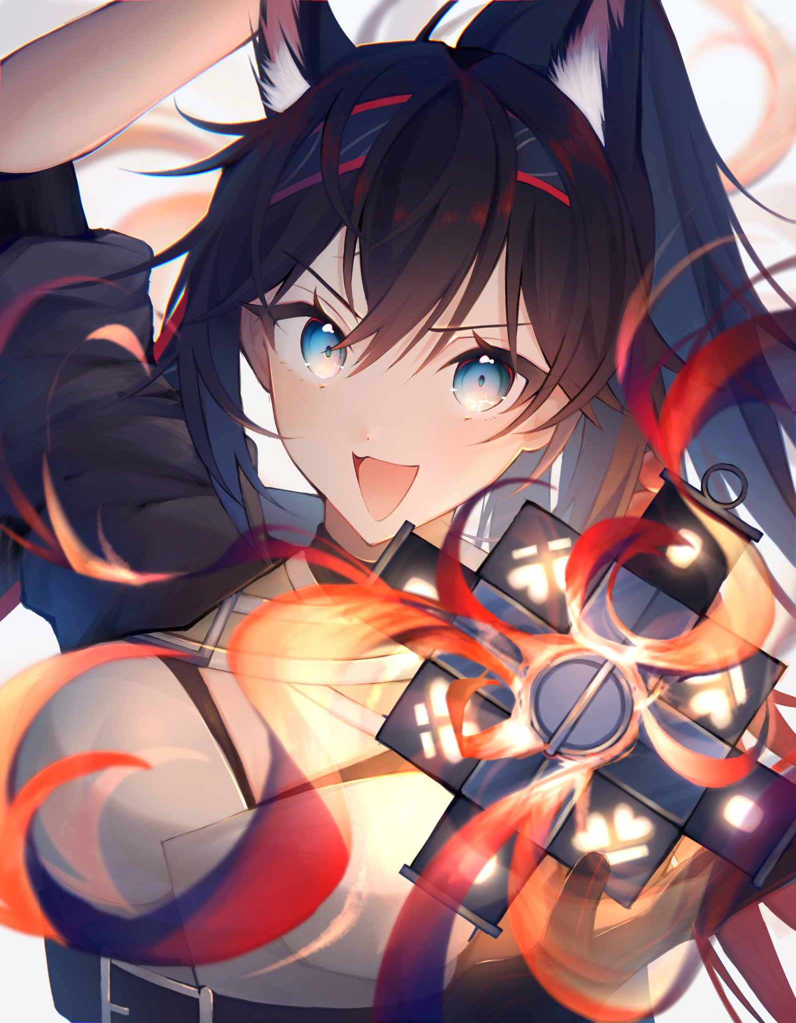 1girl :d aa_ito_sakana animal_ear_fluff animal_ears arknights arm_up black_hair black_hairband black_jacket blaze_(arknights) blaze_the_igniting_spark_(arknights) blue_eyes chromatic_aberration commentary_request fire hair_between_eyes hairband highres jacket long_hair looking_at_viewer magic open_mouth pyrokinesis shirt smile solo upper_body white_shirt