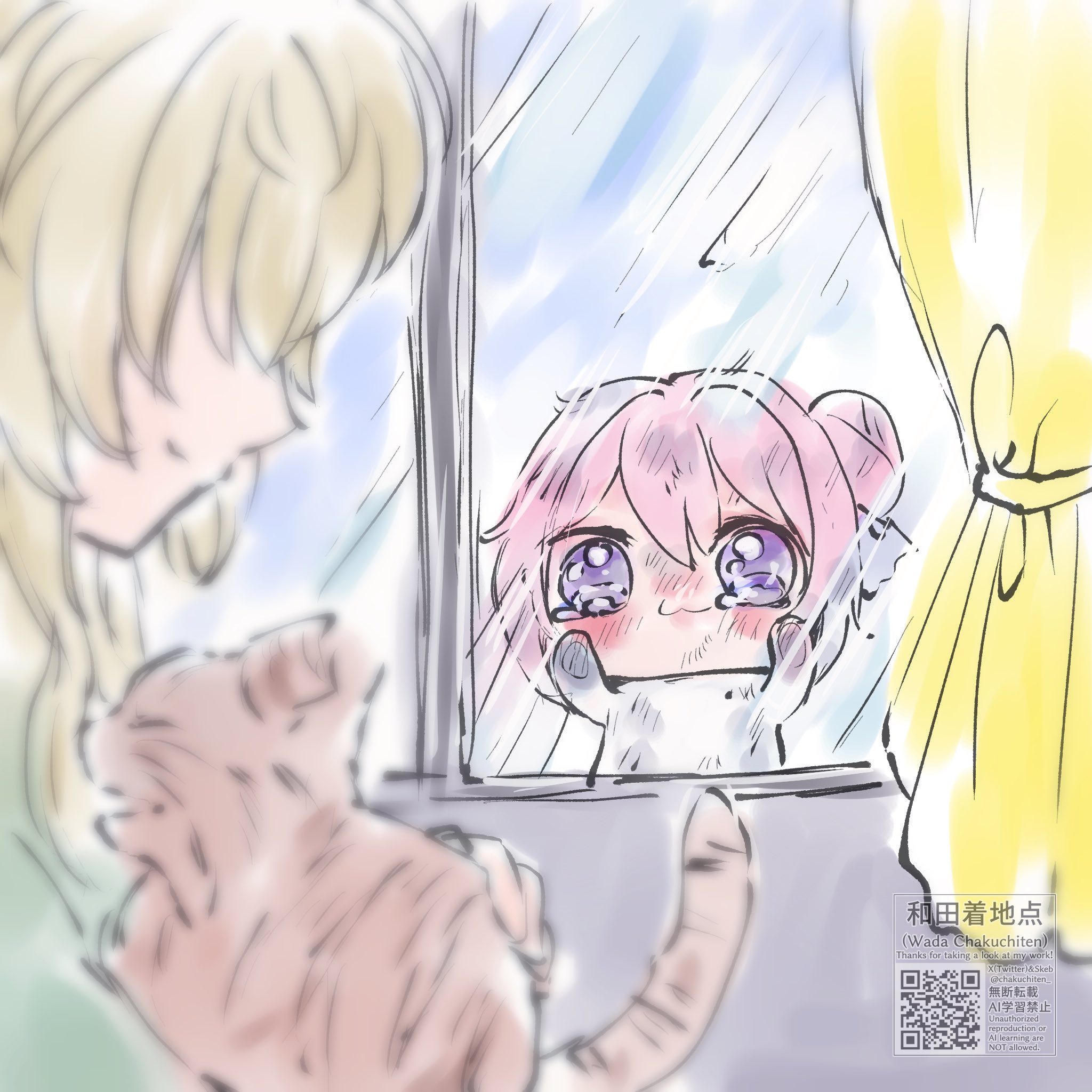 2girls blush cat commentary_request curtains doro_(nikke) goddess_of_victory:_nikke highres multiple_girls outdoors pink_hair purple_eyes rain short_hair smile tears wada_chakuchiten whiskers window