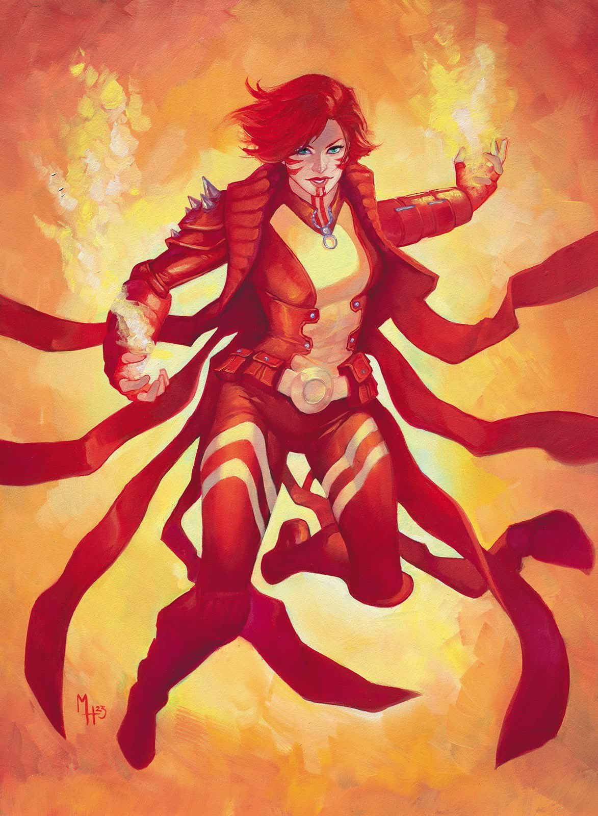 1girl bodysuit boots coat commentary english_commentary facepaint facial_mark fingerless_gloves fire floating_clothes full_body gloves green_eyes highres knee_pads looking_at_viewer looking_up marvel meghan_hetrick multicolored_bodysuit oil_painting_(medium) orange_background painting_(medium) parted_lips pyrokinesis rachel_summers red_background red_bodysuit red_boots red_coat red_gloves red_hair red_lips red_theme short_hair solo spikes superhero_costume traditional_media western_comics_(style) x-men yellow_background yellow_bodysuit yellow_theme