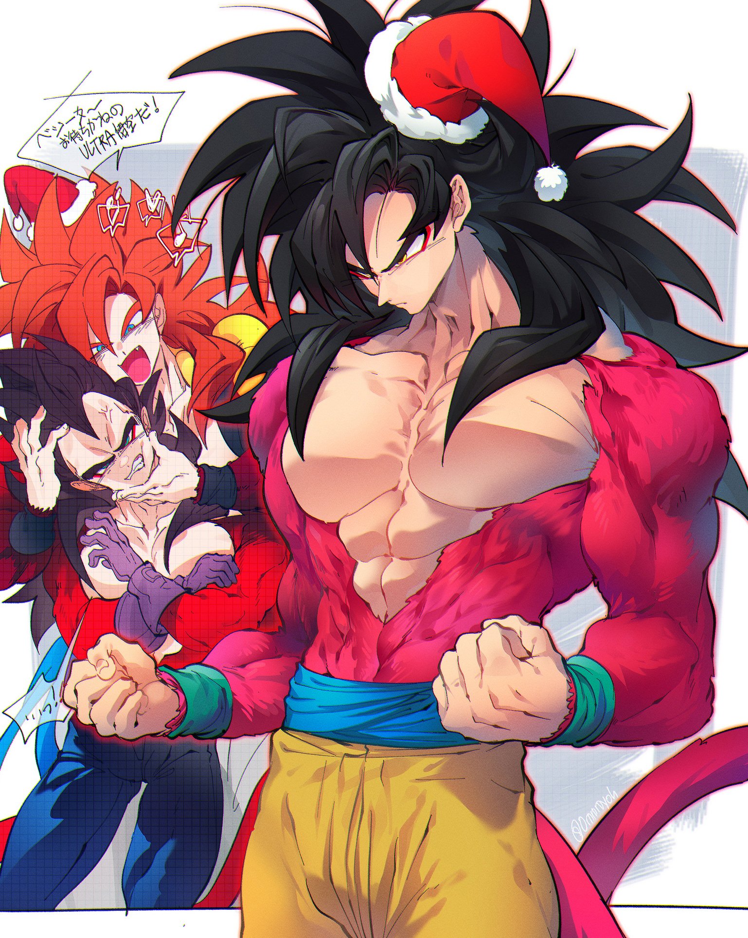 black_hair blue_eyes blue_sash closed_mouth dougi dragon_ball dragon_ball_gt gloves gogeta highres long_hair male_focus metamoran_vest monkey_boy monkey_tail multiple_boys muscular muscular_male ommmyoh open_mouth pants red_fur saiyan sash smile son_goku spiked_hair super_saiyan super_saiyan_4 tail twitter_username vegeta wristband yellow_pants