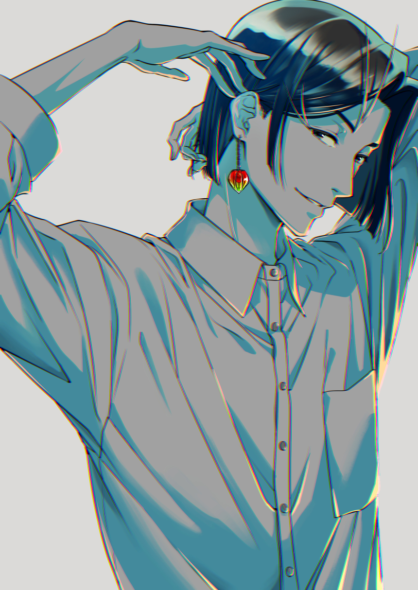 1boy arm_behind_head arms_up ayasegawa_yumichika black_eyes black_hair bleach collared_shirt commentary_request earrings highres jewelry lido_an0 male_focus shirt smile solo upper_body