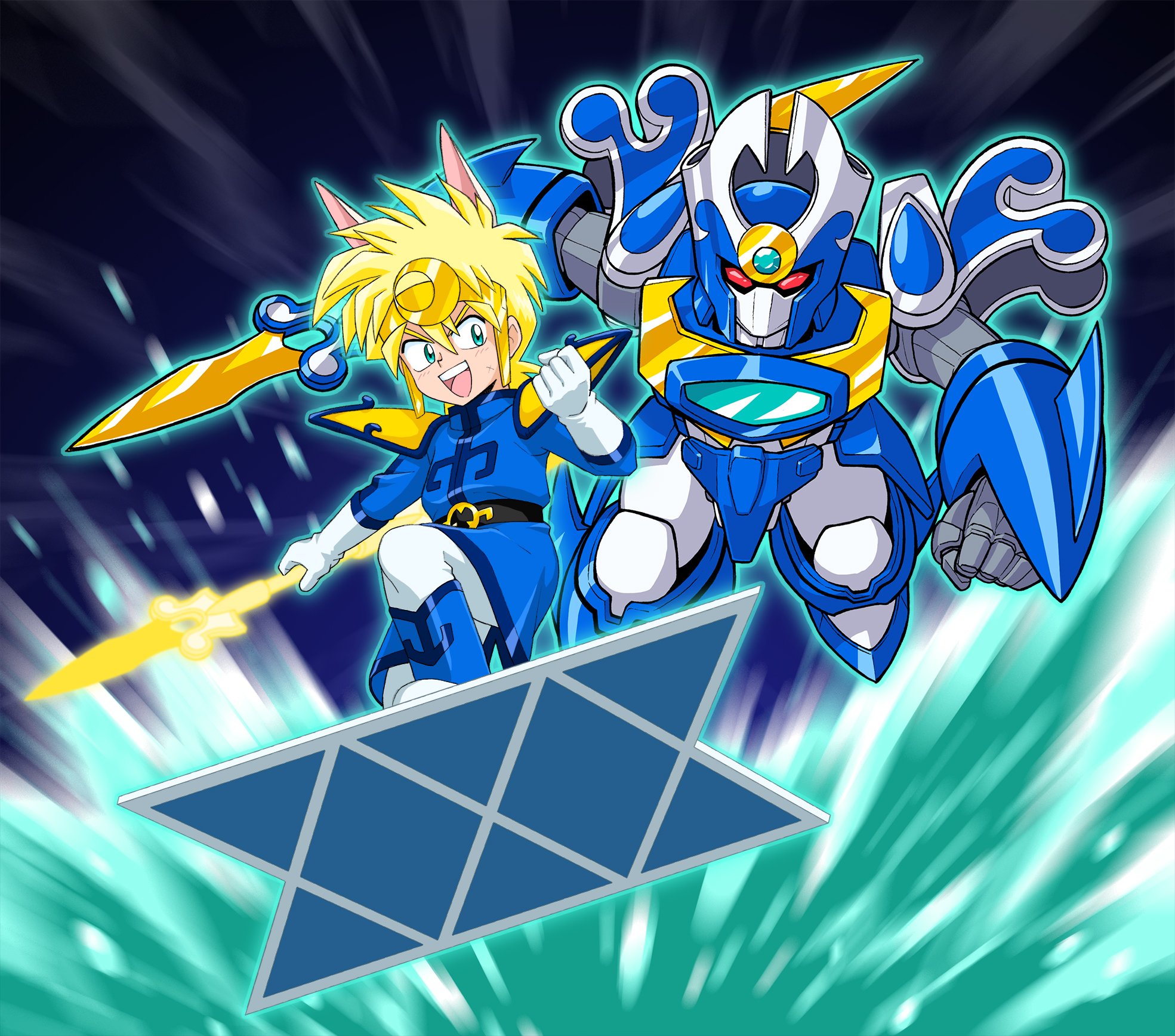 1boy animal_ears aquabeat armor belt black_belt blonde_hair blue_boots blue_eyes blue_tunic boots commentary_request crescent cross_scar facial_scar gloves hand_up headband highres holding holding_polearm holding_weapon madou_king_granzort male_focus mecha mizutani_kenta on_one_knee open_mouth pants polearm rabi_(granzort) robot scar scar_on_cheek scar_on_face short_hair shoulder_armor smile spear teeth tunic upper_teeth_only water weapon white_gloves white_pants yellow_headband