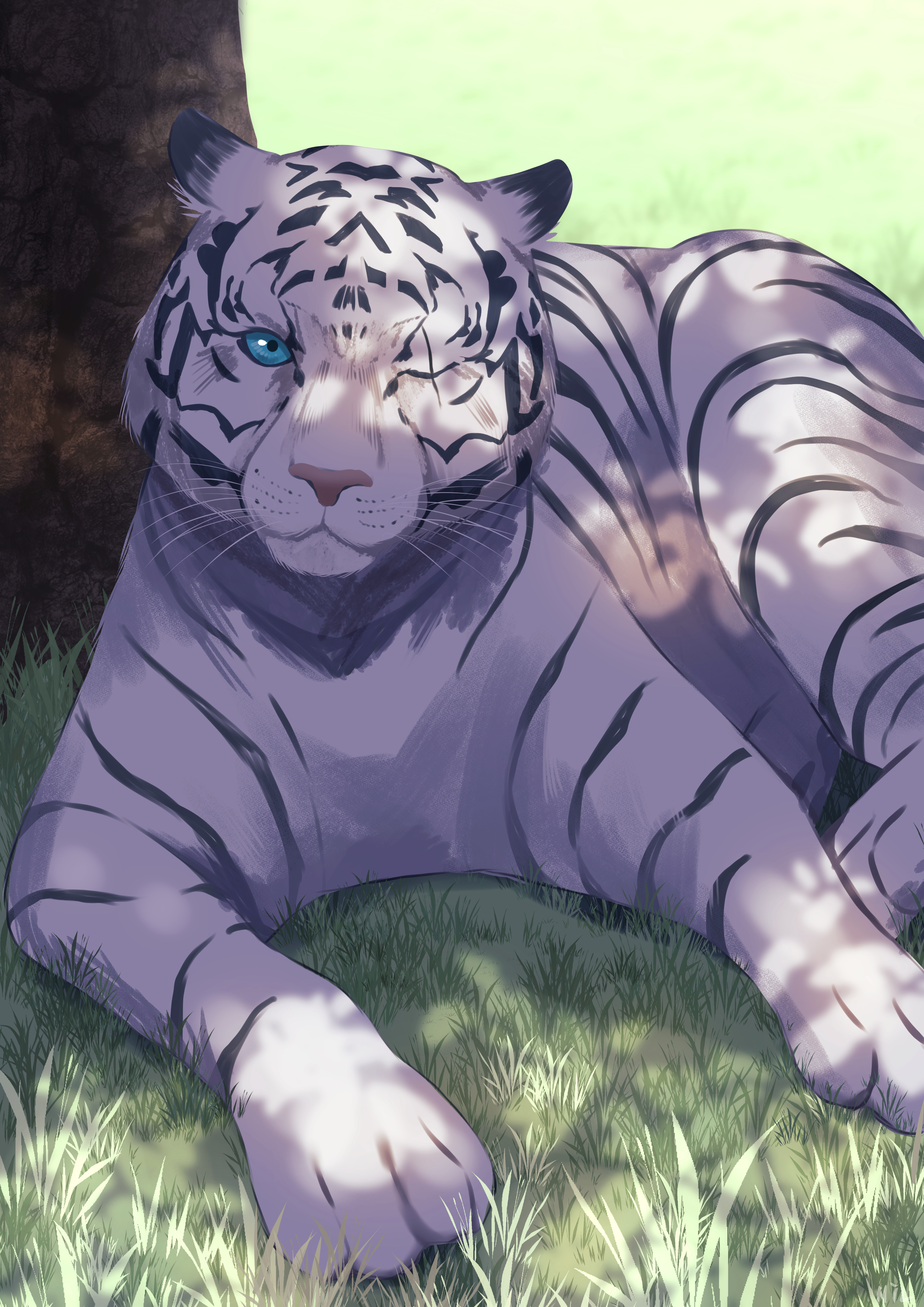 absurdres blue_eyes byakko_(heaven_burns_red) commentary dappled_sunlight day grass heaven_burns_red highres looking_at_viewer lying nil_(pixiv_53614557) no_humans on_ground on_stomach one_eye_closed outdoors scar scar_across_eye scar_on_face sunlight tiger tree white_tiger