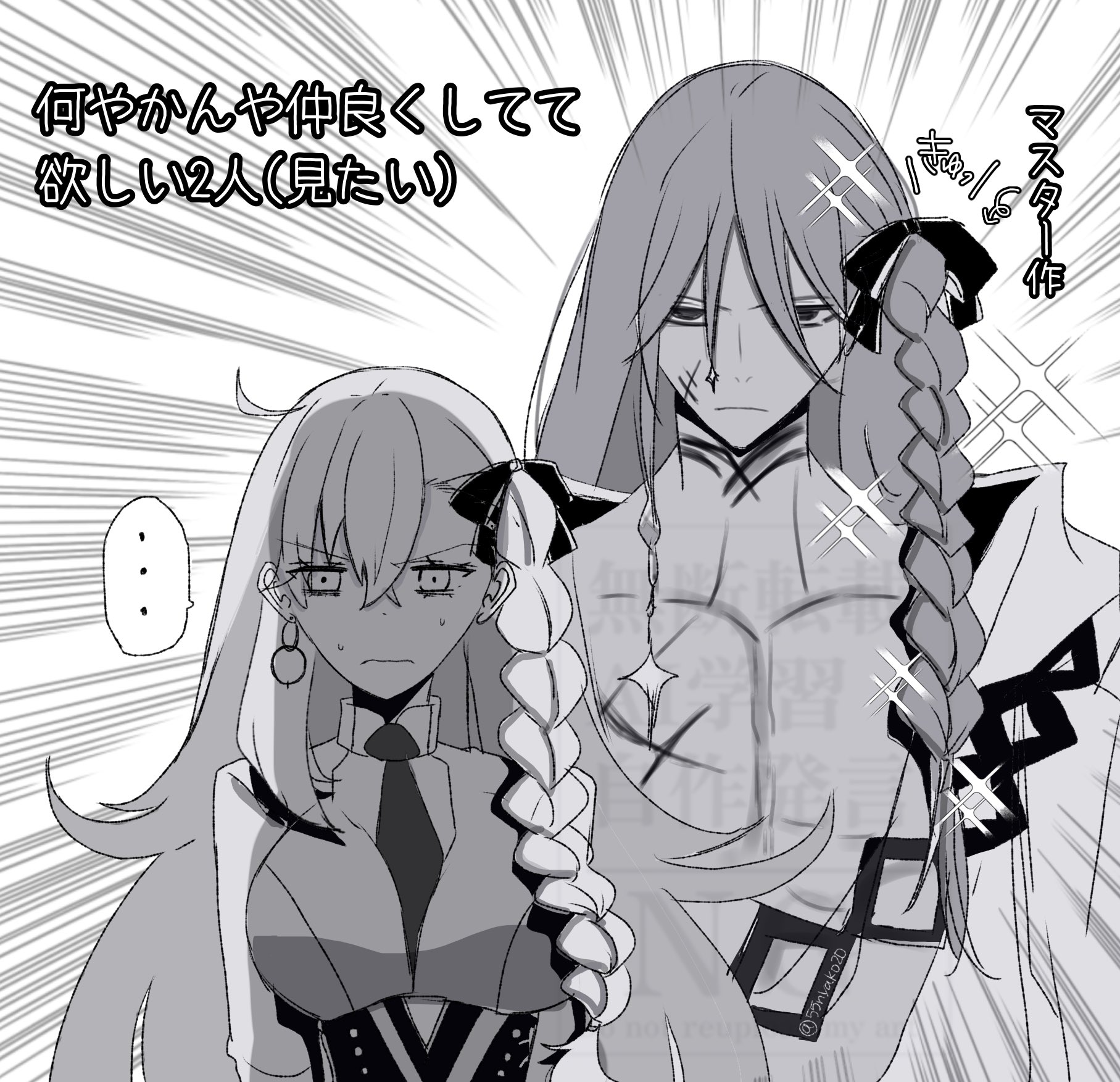 ... 55nyako20 ahoge azrael_(grand_assassin)_(fate) bow braid breasts chain commentary_request earrings fate/grand_order fate_(series) frown hair_bow highres jewelry large_breasts long_hair muscular muscular_male necktie olga_marie_animusphere olga_marie_animusphere_(unbeast) scar sparkle sweatdrop translation_request very_long_hair