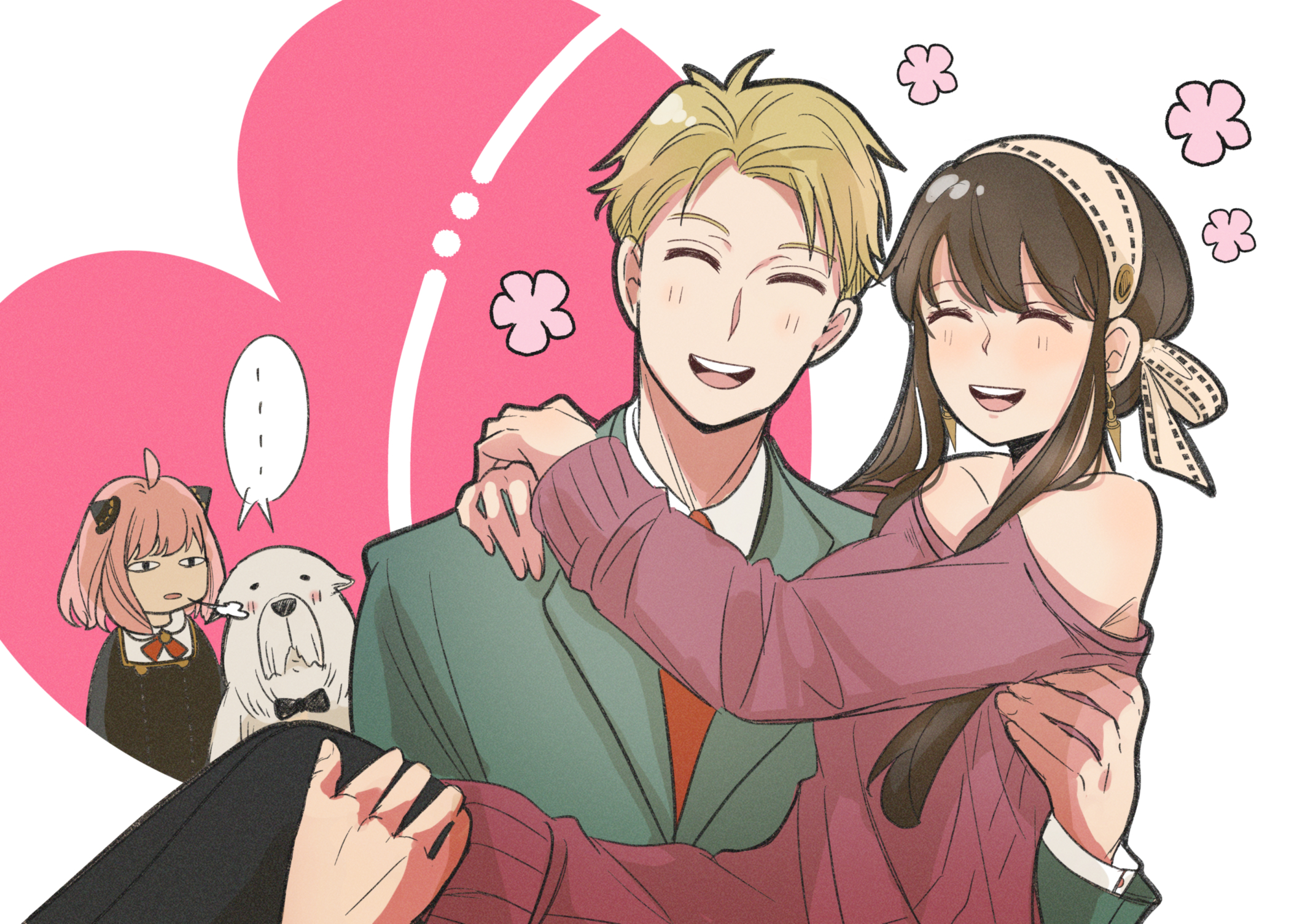 1boy 2girls ^_^ ahoge alex_(sandora) antenna_hair anya_(spy_x_family) arms_around_neck bare_shoulders black_hair black_pantyhose blonde_hair bond_(spy_x_family) breasts carrying child closed_eyes commentary_request couple dress earrings eden_academy_school_uniform gold_earrings green_jacket hairband hairpods happy_aura heart heart_background hetero highres hug husband_and_wife jacket jewelry large_breasts long_sidelocks multiple_girls necktie off-shoulder_sweater off_shoulder open_mouth pantyhose pink_hair princess_carry puff_of_air red_necktie red_sweater school_uniform short_hair short_hair_with_long_locks sidelocks smile spy_x_family sweater sweater_dress teeth twilight_(spy_x_family) upper_body upper_teeth_only very_short_hair white_background white_hairband yor_briar