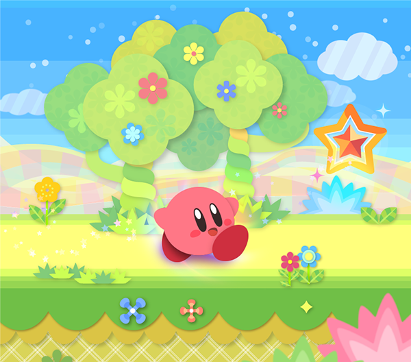 3d_warp_star blue_flower blue_sky blush blush_stickers cloud commentary_request day flower full_body grass kirby kirby:_triple_deluxe kirby_(series) magumagu_(mag2) nintendo no_humans open_mouth outdoors pink_flower sky smile solo star_(symbol) tree yellow_flower