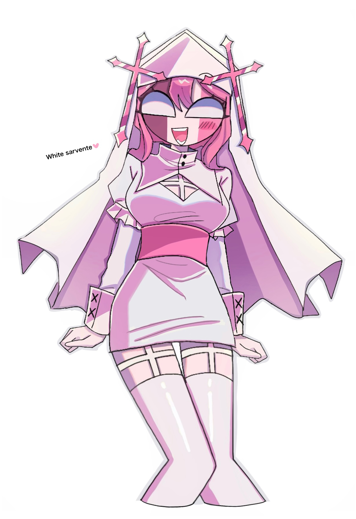 1girl :d alternate_color arms_at_sides belt blank_eyes breasts character_name cleavage_cutout clothing_cutout colored_skin commentary_request cropped_legs cross_hat_ornament double-parted_bangs dress english_text friday_night_funkin' frilled_sleeves frills garter_straps hair_between_eyes hat highres impossible_clothes impossible_dress juliet_sleeves knees_together_feet_apart kokococo924 long_sleeves looking_at_viewer medium_breasts mid-fight_masses nun open_mouth pencil_dress pink_belt pink_hair pink_skin puffy_sleeves sarvente_(mid-fight_masses) short_hair sidelocks simple_background sleeve_cuffs smile solo teeth thigh_gap thighhighs tongue veil white_background white_dress white_hat white_thighhighs white_veil zettai_ryouiki