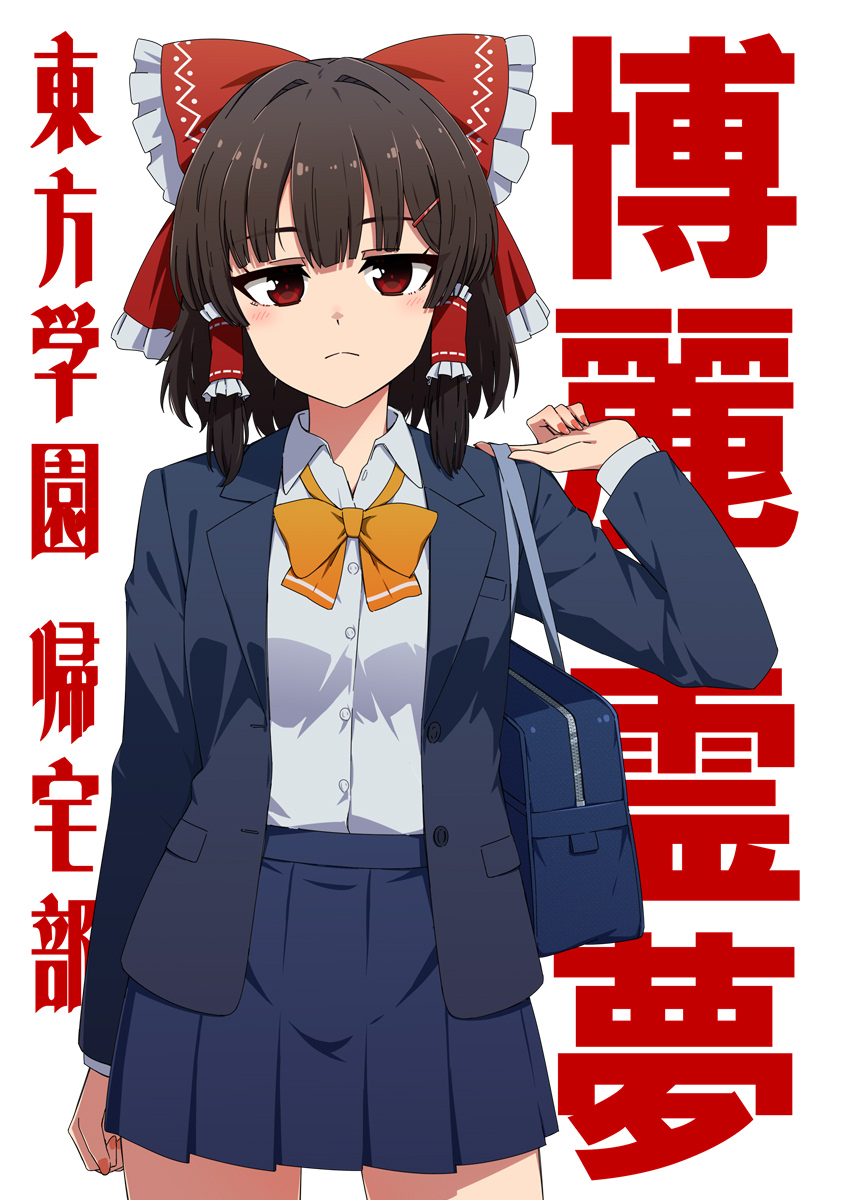 1girl bag black_jacket blue_bag bow bowtie breasts brown_hair character_name closed_mouth collared_shirt commentary_request cowboy_shot frilled_bow frilled_hair_tubes frills hair_bow hair_tubes hakurei_reimu highres jacket long_hair looking_at_viewer necono_(nekonosora1207) open_clothes open_jacket red_bow red_eyes school_bag school_uniform shirt shoulder_bag small_breasts solo touhou translation_request white_shirt yellow_bow yellow_bowtie