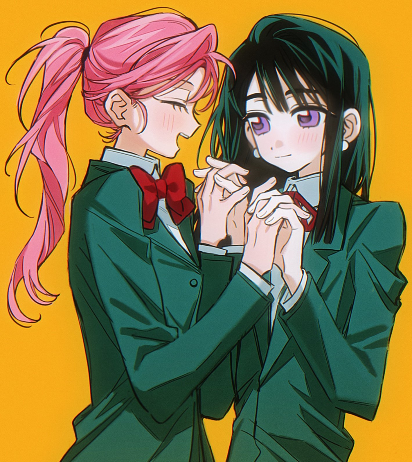 2girls alien_stage black_hair blazer bow bowtie closed_eyes closed_mouth collared_shirt earrings green_jacket highres holding_hands jacket jewelry long_hair long_sleeves mizi_(alien_stage) multiple_girls open_mouth pink_hair ponytail prototype_design purple_eyes red_bow red_bowtie school_uniform sea_foam shirt simple_background smile sphere_earrings sua_(alien_stage) white_shirt yellow_background