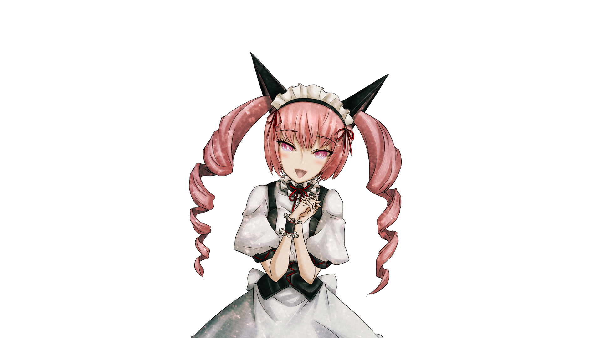1girl akiha_rumiho animal_ear_hairband animal_ears apron back_bow belt_around_waist belt_buckle blush bow breasts buckle buttons cat_ears collar dress drill_hair fake_animal_ears frilled_collar frilled_dress frilled_hairband frills game_cg hair_between_eyes hairband highres huke interlocked_fingers long_hair looking_at_viewer maid maid_apron maid_headdress mayqueen_maid_uniform narrowed_eyes official_art own_hands_together pink_eyes pink_hair pink_lips puffy_short_sleeves puffy_sleeves red_ribbon ribbon ribbon-trimmed_collar ribbon-trimmed_corset ribbon-trimmed_hairband ribbon-trimmed_sleeves ribbon_trim ringed_eyes science_adventure shiny_lips short_sleeves small_breasts smile solo sprite steins;gate transparent_background tsurime twin_drills twintails white_apron white_bow white_dress white_wrist_cuffs wrist_cuffs