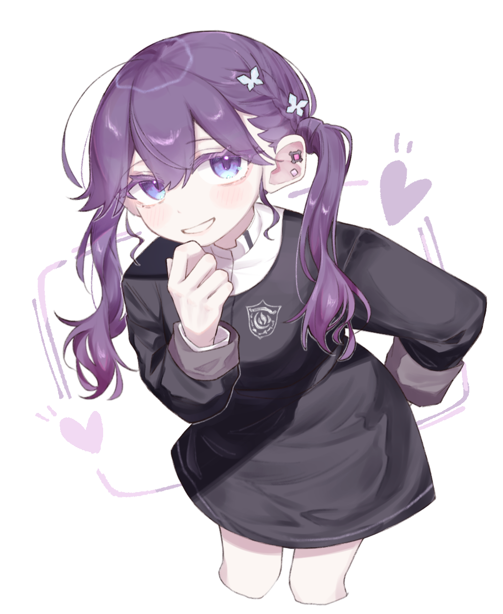 1girl black_jacket black_skirt blue_eyes blush braid butterfly_hair_ornament commentary cropped_legs ear_piercing gakuen_idolmaster gokugetsu_gakuen_school_uniform hair_ornament heart highres idolmaster jacket kaya_rinha komaki_(komaki0769) long_hair long_sleeves looking_at_viewer piercing purple_hair revision school_uniform skirt smile solo twintails