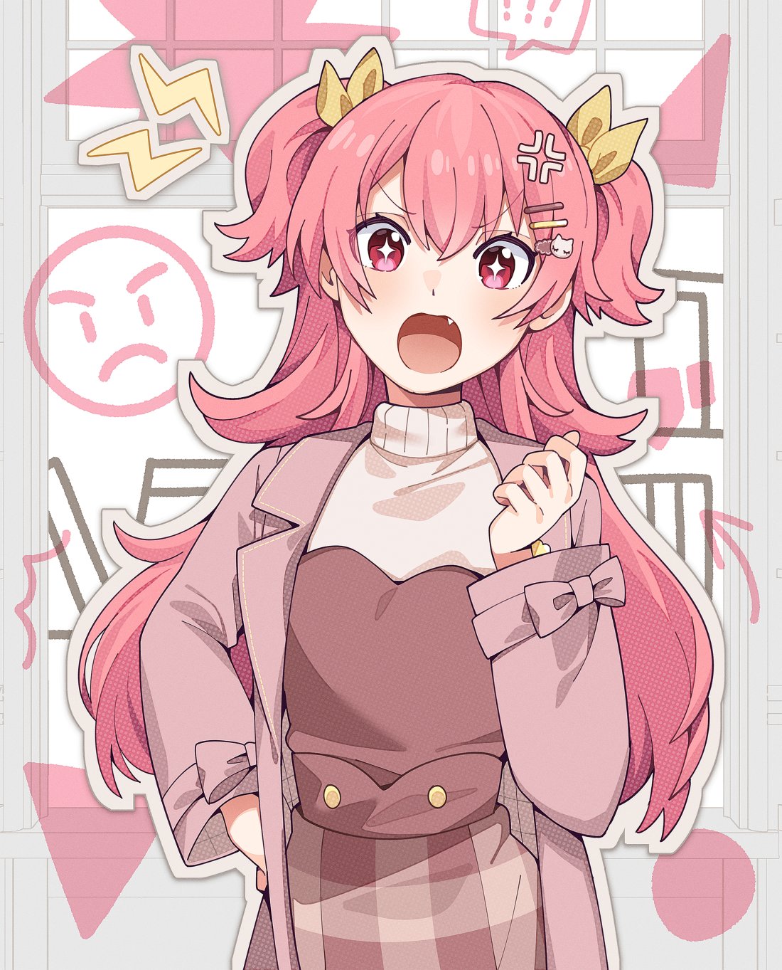 1girl anger_vein arrow_(symbol) circle clenched_hand coat commentary_request fang hair_ornament hairclip hand_on_own_hip highres lapels lightning_bolt_symbol long_hair long_sleeves looking_at_viewer mitsumine_(ookami_no_oyashiro) momoi_airi notched_lapels open_clothes open_coat open_mouth pink_eyes pink_hair project_sekai short_twintails solo star_(symbol) star_in_eye symbol_in_eye triangle turtleneck twintails upper_body